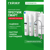 Технология обратного осмоса, использованная в фильтре Гейзер Престиж Смарт, заключается в фильтрации воды через полупроницаемую мембрану. Размеры пор мембраны настолько малы, что пропускают только молекулы воды. Размер молекул большинства примесей, а также бактерий и вирусов значительно больше молекул воды, поэтому они не проходят через мембрану. Система работает при давлении в подводящей магистрали не менее 3 атм.