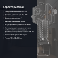 Пропускная способность: 6 м3/ч Диапазон рабочего давления: 0,15 - 0,8 МПа (рекомендовано до 0,6 МПа) Диаметр подключения 1" Материал соединений: Нержавеющая сталь SUS 304. Ресурс фильтрующего элемента: 5 лет. Тип фильтрующего элемента: Сетчатые ячейки с увеличенной площадью фильтрации и вихревой промывкой SUS 316. Тонкость фильтрации - 50 микрон.