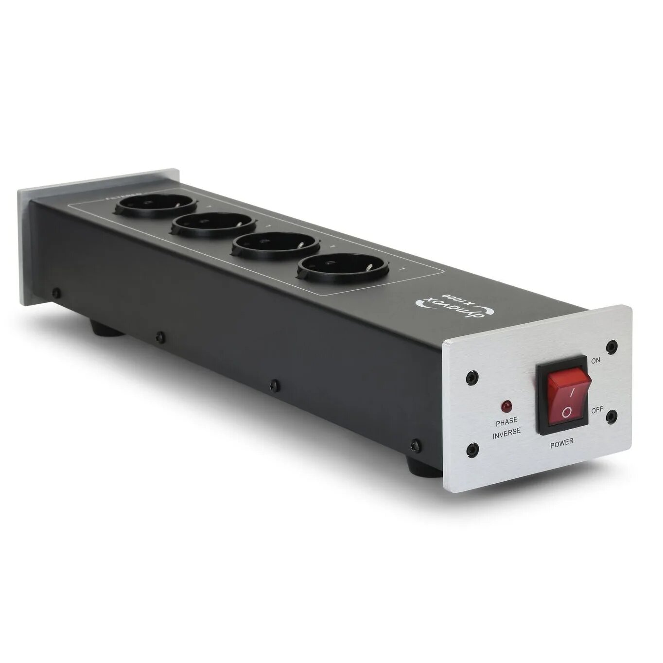 Dynavox X1000 — младшая модель успешной серии фильтров-дистрибьютеров питания Dynavox. Модель X1000 имеет 4 розетки с функцией фильтрации, что вполне достаточно для подключения системы из нескольких Hi-Fi компонентов таких как усилитель, тюнер, CD-плеер, стример или проигрывателей винила. Dynavox X1000 собран в прочном металлическом корпусе, имеет автоматический выключатель 10 A и индикатор фазы (загорается, если положение фазы в линии питания неверное). Максимальная мощность потребителей 2300 Вт. Максимальный ток 10 А.