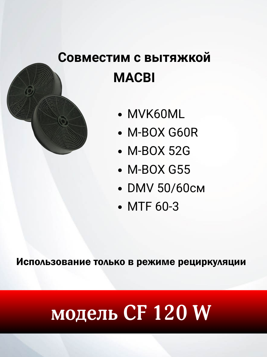 Угольный фильтр CF-120W подходит для следующих моделей вытяжек Macbi: DMV 50см/60см, MVK60ML. В комплект поставки входит 2 фильтра, что позволяет обеспечить очистку воздуха в двух зонах одновременно.