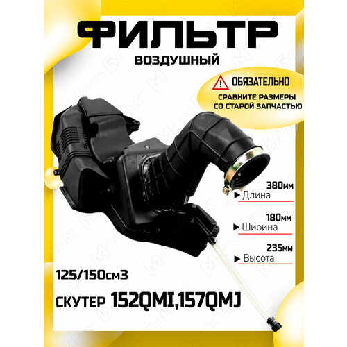 Воздушный фильтр служит для фильтрации воздуха, необходимого для дозировки горючей смеси, подаваемой карбюратором в камеру сгорания. Подходит для китайского скутера с двигателем 152QMI,157QMJ и объемом 125-150см3. Основные характеристики: - Общий размер: 380 × 180 × 235 мм (прочный). - Длина патрубка: 200 мм (достаточно для гибкого монтажа к карбюратору). - Диаметр патрубка: Внешний 51 мм, внутренний 44 мм (стандартные размеры для надежной герметизации). - Расстояние между отверстиями креплений по центрам: 273 мм. - Комплектация: Фильтр идет в комплекте с треугольным фильтрующим элементом.