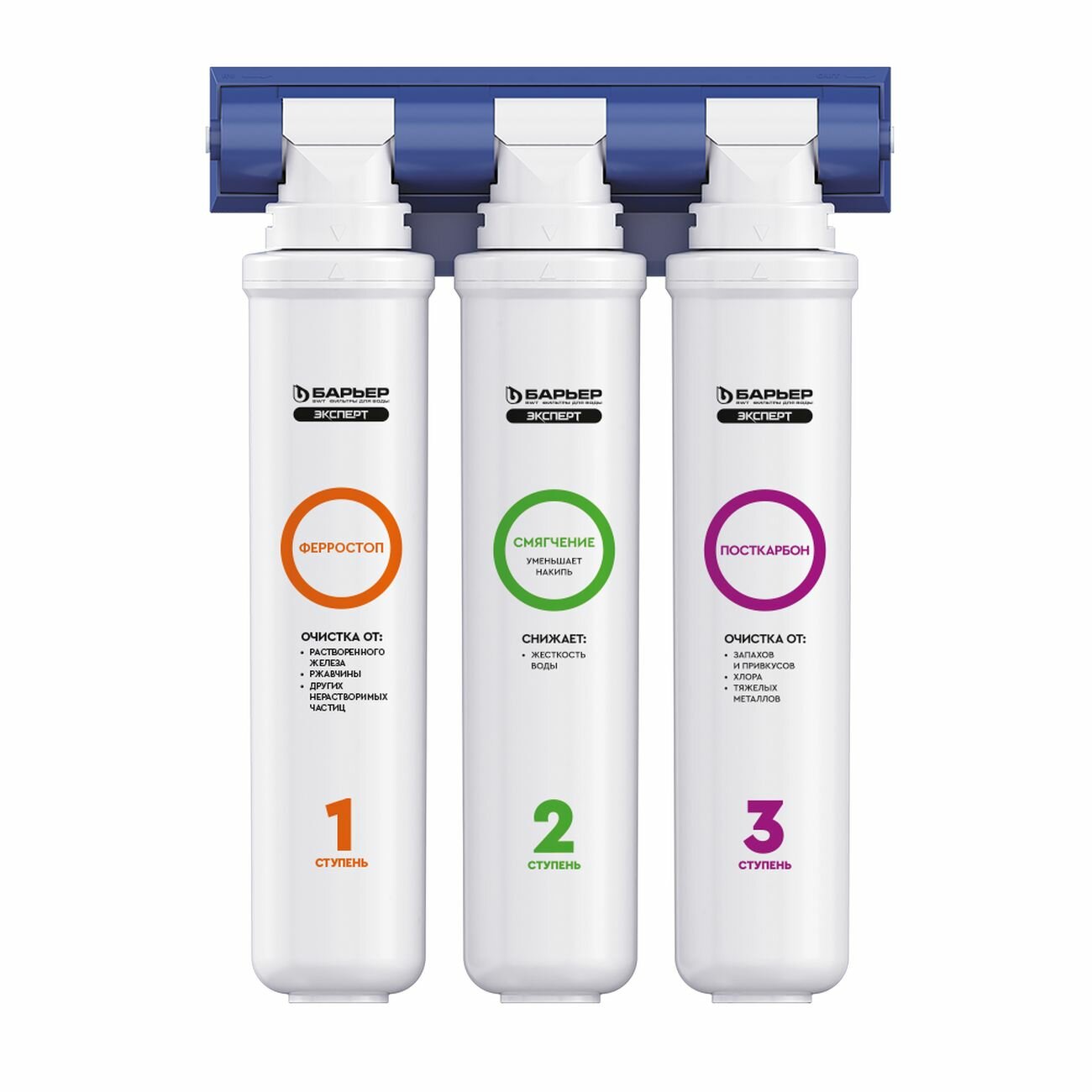 Бренд: БАРЬЕР; Страна-производитель: Россия; Тип: Картриджи; Цвет: Белый; Тип упаковки: Картонная коробка; Вес, г/мл: 2260; Размер, см: 33,8x8,2x23,2; Ресурс: 10000 л; Основной цвет: Белый; Количество предметов: 3 Картриджи семейства БАРЬЕР эксперт Комплекс, позволяют получить вкусную безопасную воду и забыть о проблеме накипи, металлическом привкусе воды и желтоватом осадке в чайнике. Производительность - 2 л/мин. Ресурс - 10000 литров. В комплект входит:1. БАРЬЕР эксперт Ферростоп содержит специальный многослойный материал, эффективно удаляющий не только железистые примеси, но и растворенное железо. Финишный слой препятствует сбросу отфильтрованного железа в чистую воду.2. БАРЬЕР эксперт Смягчение предотвращает образование накипи. Эффективно снижает карбонатную жесткость, из-за которой образуется осадок в чайнике. Средний ресурс ступени при жесткости от 3 до 5 мг-экв/л составляет 500 литров.3. БАРЬЕР эксперт ПостКарбон - финишная очистка и кондиционирование, устранение неприятных привкусов и остаточного хлора. В линейке эксперт воплощены наши лучшие разработки, что даёт вам преимущества: технология SmartLock предотвращает протечки и срыв картриджа под давлением. технология OneTouch позволяет быстро поменять картридж без специальных знаний, инструментов или ключей. Протестированы по стандарту NSF (США) на максимальное давление 30 АТМ. 4-х кратный запас прочности.