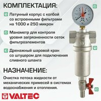 Фильтры самоочищающиеся промывные 1/2″ ВР VALTEC (2 шт) с манометром и сливным краном / Каскадный грязевик ДУ15 для очистки воды с сетками 1000+250мкм: сравнение цен, характеристики, фото, актуальное наличие и цены.