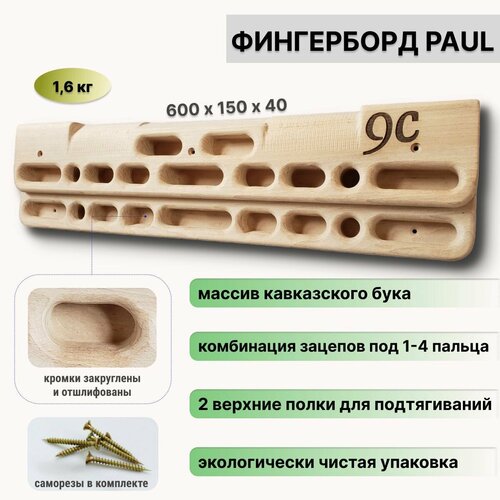 Популярная для спортсменов модель фингерборда, выполнена из массива кавказского бука. Предназначена для тренировок как новичков, так и продвинутых скалолазов, гарантирует отличный хват и в то же время сохраняет Вашу кожу от повреждений. Широкий ассортимент зацепок под 1-4 пальца, верхние 2 полки для разминочного подтягивания сделают Ваши занятия продуктивными и совместимыми с различными программами тренировок.