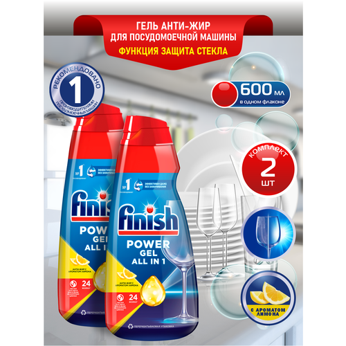 FINISH All in 1 Max Гель для ПММ Анти-жир Лимон 600 мл. х 2 шт. Гель для посудомоечных машин Finish All in 1 Max Анти-жир с ароматом лимона эффективно устраняет трудные загрязнения с первого раза. Средство способно убрать следы от кофе, застывшего жира и подгоревшей пищи и сделать посуду по-настоящему чистой. Гель справляется с загрязнениями при низких температурах и на коротких циклах. Средство обладает приятным цитрусовым ароматом и легко смывается. Finish гель All in 1 для мытья посуды в посудомоечных машинах с быстрорастворимой формулой обеспечивает ослепительный блеск и чистоту посуды даже на коротких циклах.