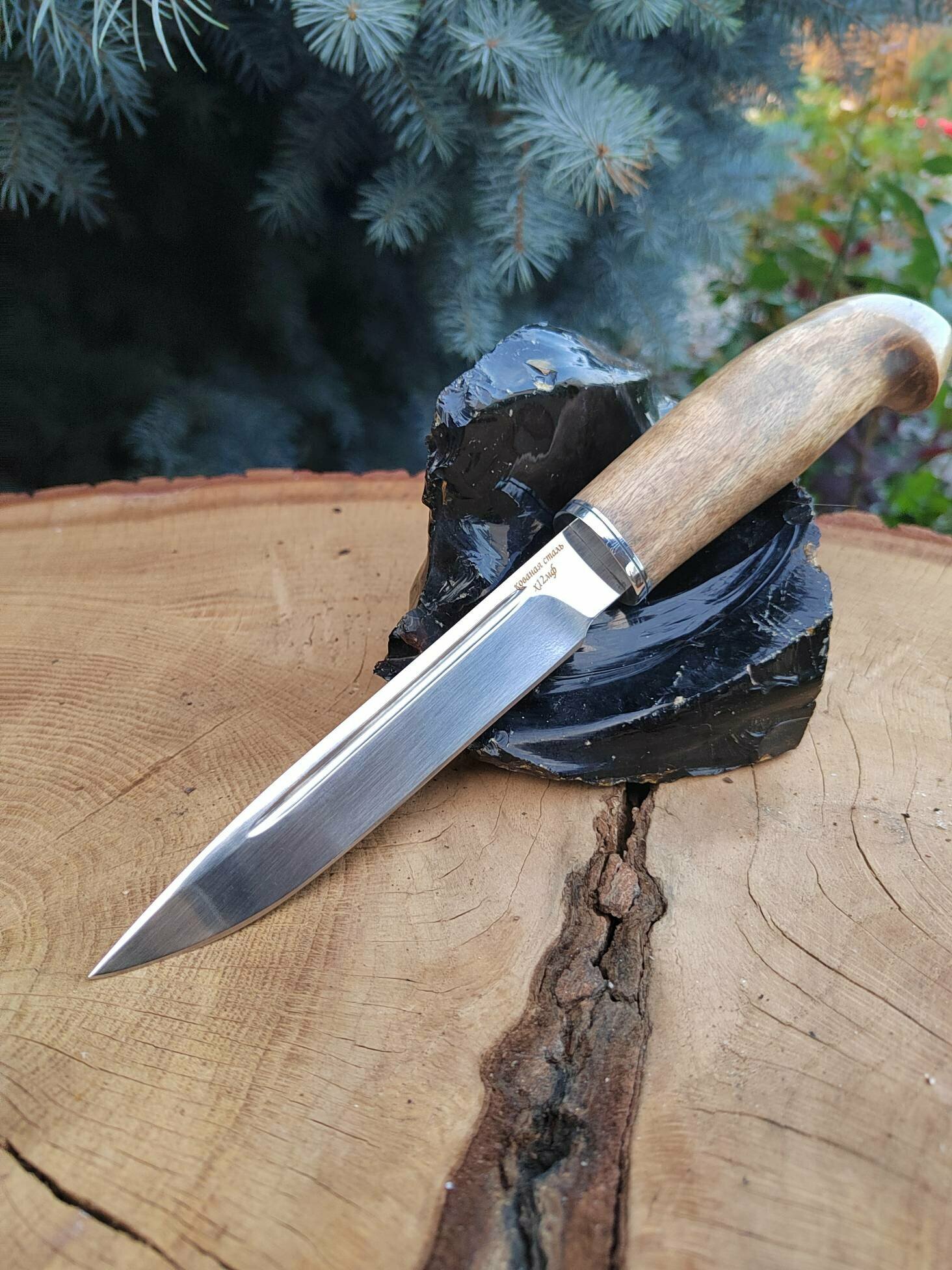 Разделочный нож Пукко! Материал клинка - кованая нержавеющая сталь х12мф. Твёрдость стали 60-62HRC. Отлично держит заточку и не требует ухода.