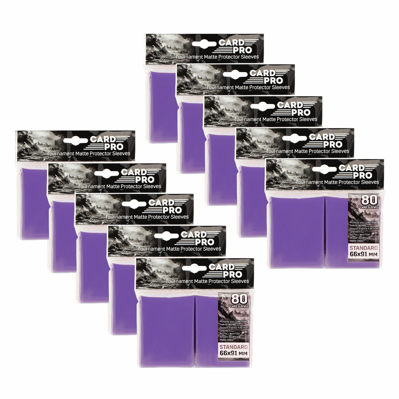 10 упаковок из 800 цветных протекторов Card-Pro размером 66х91мм. Протекторы подходят для большинства коллекционных карточных игр. Купив одну пачку протекторов, вы можете "нарядить" всю колоду, включая сайдборд, а также останется 5 шт. протекторов "про запас".