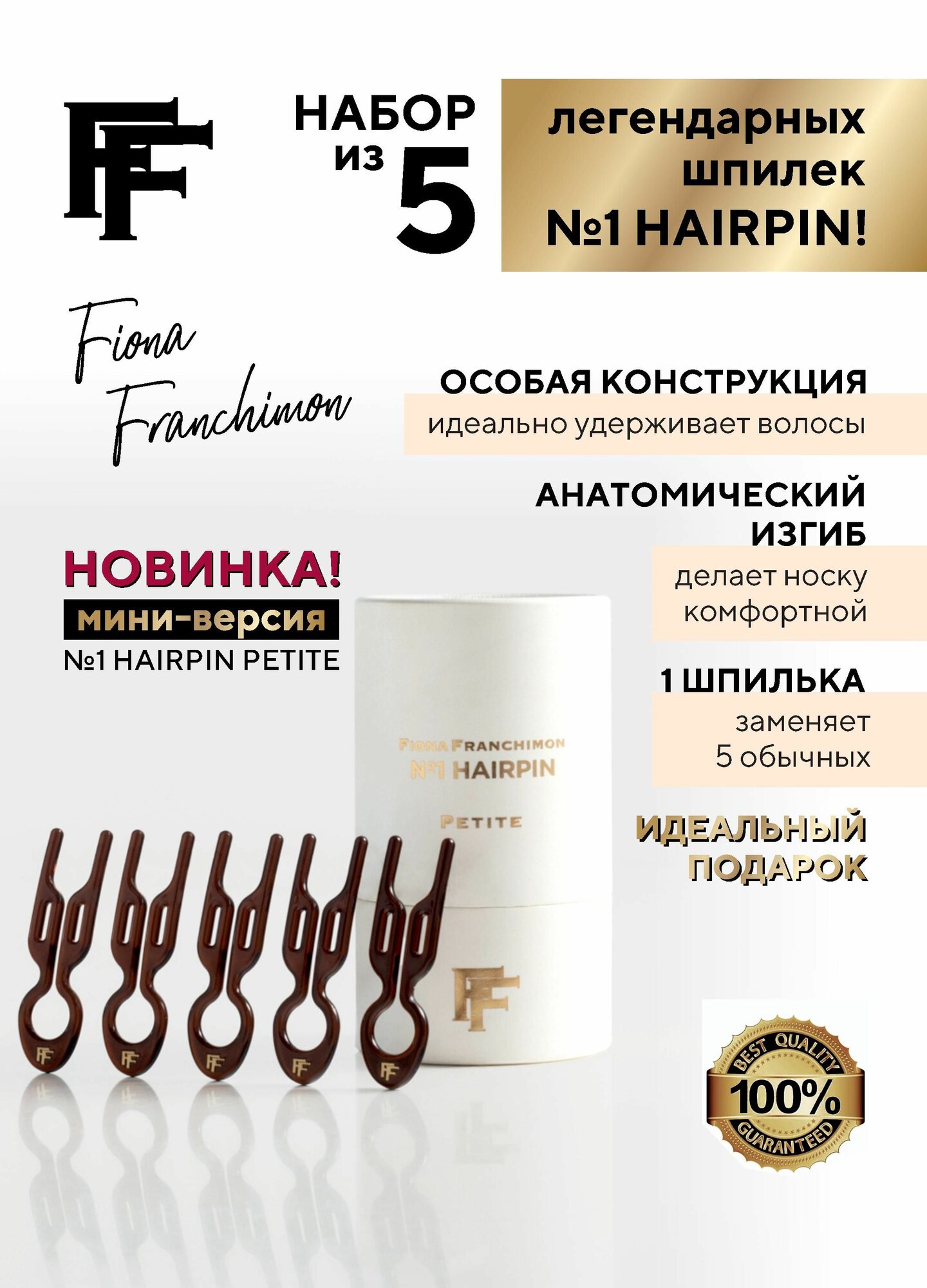 Шикарный подарок для вашей любимой женщины - Подарочный набор шпилек FIONA FRANCHIMON No1 Hairpin Brown PETITE. Этот изысканный аксессуар станет идеальным украшением для любого вечернего образа и добавит неповторимый шарм прическе. Стильная шпилька представляет собой гибкий и прочный аксессуар, обладающий лаконичным дизайном и надежной фиксацией. Он позволяет делать любые прически, которые сохранят свежий вид в течение всего дня. Набор состоит из пяти легендарных шпилек #1 hairpin коричневого цвета, они прекрасно дополнят любой стиль и цветовую гамму. Элегантные аксессуары изготовлены из качественного пластика, они легкие и удобные в использовании, максимально эргономичные, не повреждают волосы и кожу. Шпилька зафиксирует высокий хвост или повседневный пучок, романтичную прическу с плетениями или креативную вечернюю укладку. Она заменяет собой 5 обычных шпилек, не травмирует кожу головы, не создает заломов. Шпильки FIONA FRANCHIMON No1 Hairpin идеально держат прическу в течение всего дня, обеспечивая надежную фиксацию. Благодаря своей особой форме, стильному продуманному дизайну и изысканной отделке, они подчеркнут вашу индивидуальность и придадут образу изысканности и шарма. Этот набор шпилек упакован в элегантный подарочный бокс, что делает его идеальным выбором для подарка вашей девушке на любой праздник: День рождения, выпускной бал, годовщину свадьбы или 8 марта. Сделайте ее праздник особенным и запоминающимся с этим уникальным сюрпризом! Позвольте себе быть исключительной, следить за модными тенденциями и дарить себе радость каждый день с набором шпилек FIONA FRANCHIMON No1 Hairpin. Украшайте свои волосы с удовольствием и стилем, создавайте свой неповторимый образ с помощью этих прекрасных аксессуаров от стилиста с мировым именем Фионы Франшимон Прическа как на неделе моды за 5 минут у вас дома!