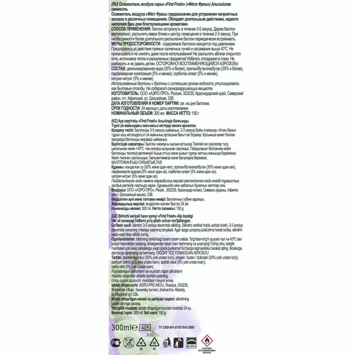 Освежитель воздуха аэрозольный First Fresh Альпийская свежесть, 300мл (2028644), 12шт.: сравнение цен, характеристики, фото, актуальное наличие и цены.