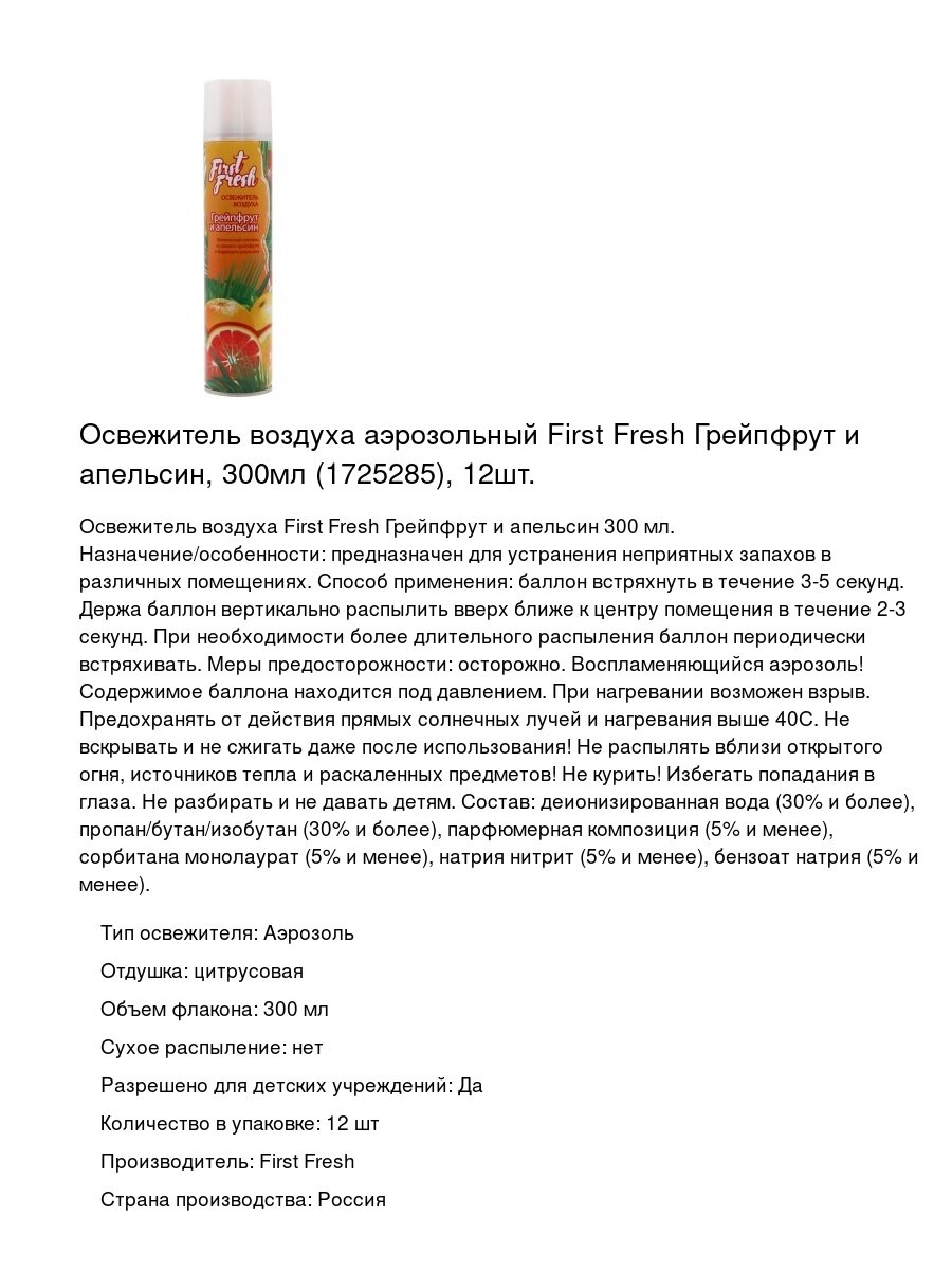 Освежитель воздуха аэрозольный First Fresh Грейпфрут и апельсин, 300мл (1725285), 12шт.: сравнение цен, характеристики, фото, актуальное наличие и цены.