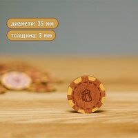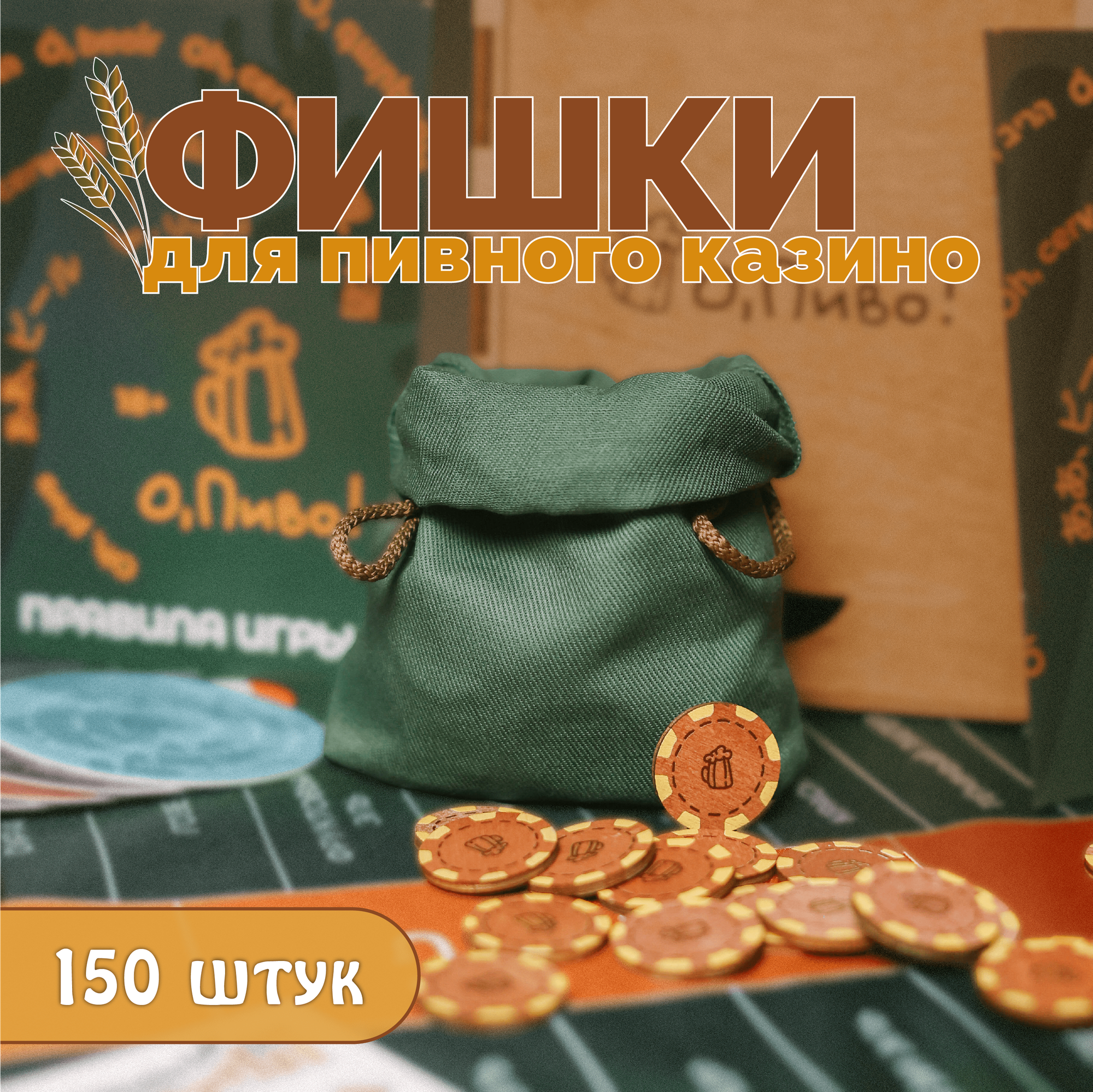 Фишки для пивного казино, изготовлены из дерева, защищены от воздействия влаги, не деформируются при намокании. В наборе 150 фишек единого номинала. Упакованы в плотный хлопковый мешок на завязочках.