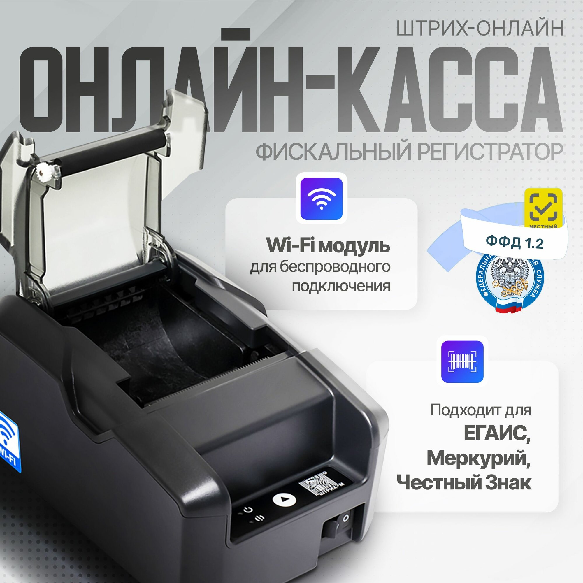 Фискальный регистратор онлайн-касса Штрих-Онлайн с Wi-Fi модулем. Подходит для маркировки товаров Честный Знак, ЕГАИС, Меркурий. Актуальная прошивка ФФД 1.2 бесплатно на сайте производителя.