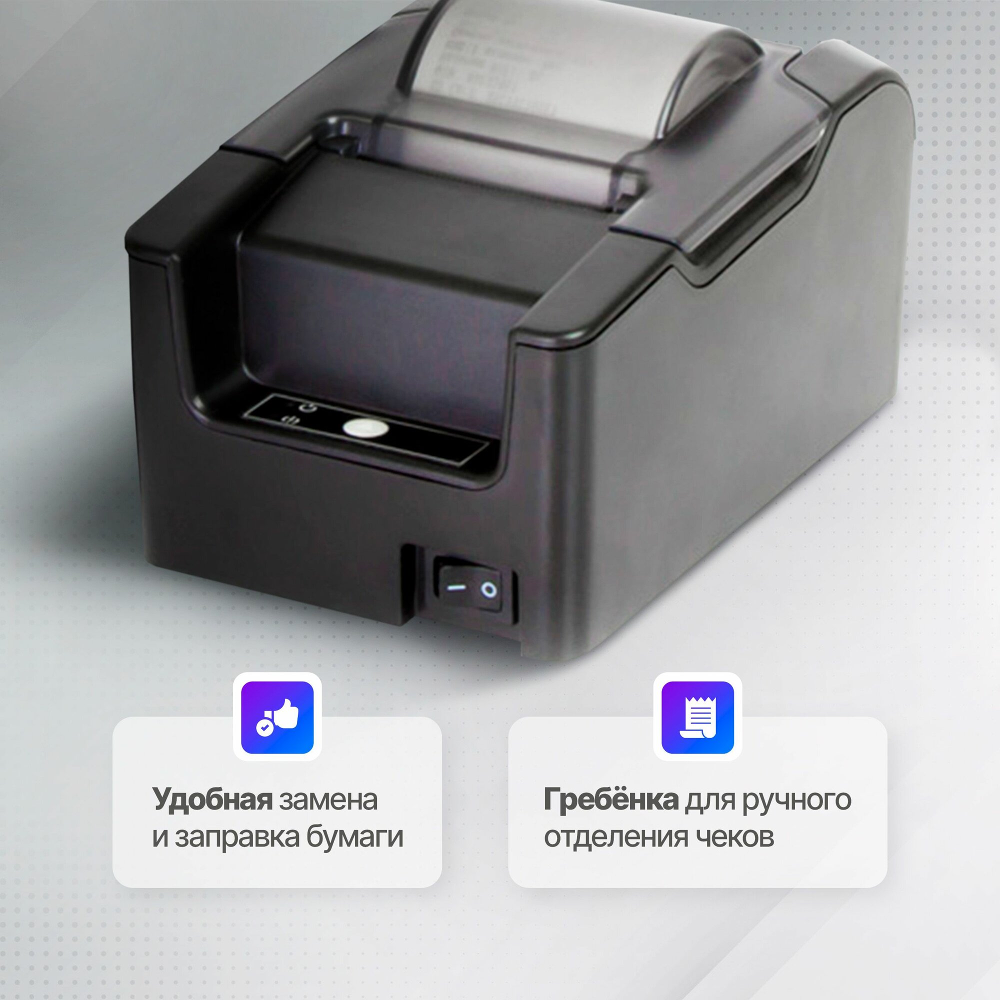 Ширина печати 57 мм, под самую популярную чековую ленту. Внешний диаметр рулона до 60 мм.