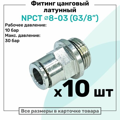 Фитинг прямой латунный NPCT 8-03, цанга 8мм — Наружная резьба G3/8″, цанговый штуцер, Пневмофитинг NBPT, Набор 10шт: сравнение цен, характеристики, фото, актуальное наличие и цены.