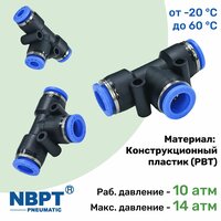 Пневматический фитинг-тройник PUT (Или Т-образный) бренда NBPT используется для соединения пневмотрубок из различных материалов.