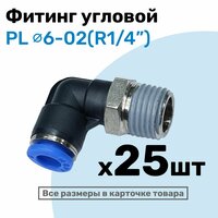 Фитинг цанговый пневматический, штуцер угловой PL 06-02 , 6мм — Внешняя резьба R1/4″, Пневмофитинг NBPT, Набор 25шт