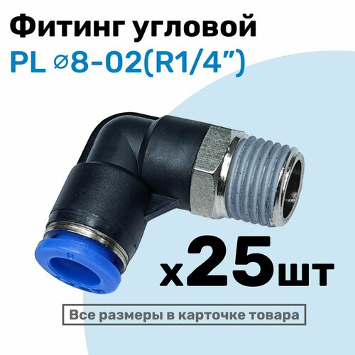 Фитинг цанговый пневматический, штуцер угловой PL 08-02 , 8мм — Внешняя резьба R1/4″, Пневмофитинг NBPT, Набор 25шт