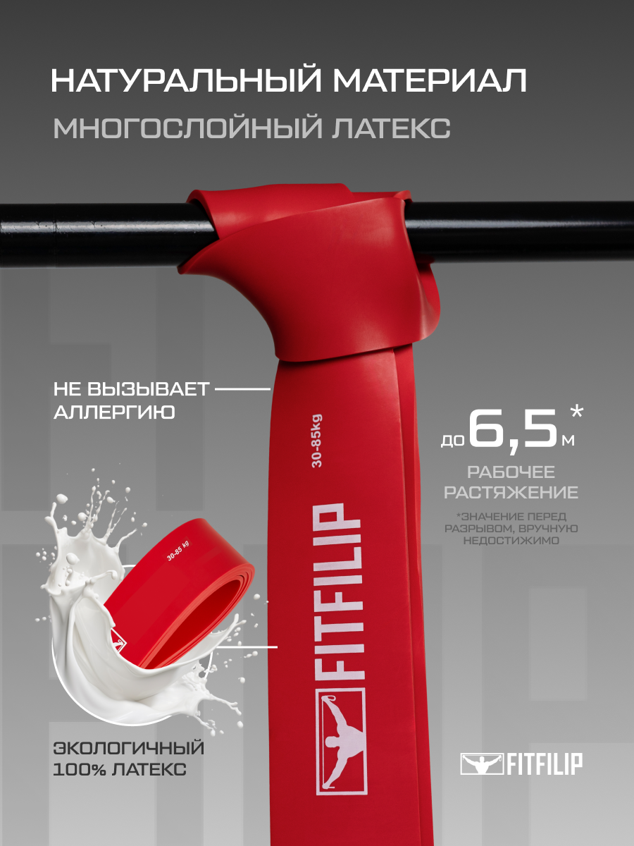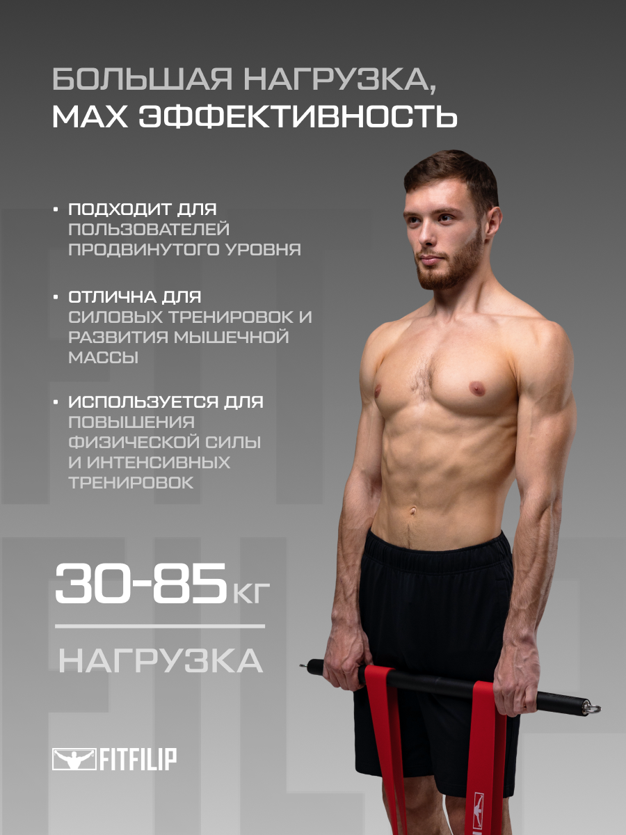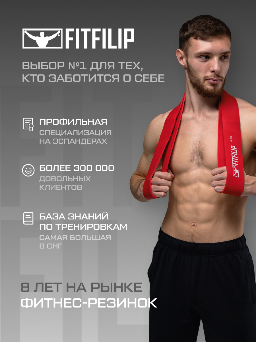 Почему вам стоит выбрать фитнес эспандеры FITFILIP? Наши резинки для фитнеса изготовлены из высококачественного многослойного латекса, экологически безопасного, прочного материала. Наши латексные петли выдерживают самые жесткие условия эксплуатации, не теряют свою эластичность и прослужат вам долгие годы. Такие кольцевые резинки подходят для домашних и уличных занятий, чтобы научиться подтягиваться на турнике детям и взрослым, для упражнений на все группы мышц, подходит для похудения, набора массы или рельефа, как начинающим, так и опытным спортсменам. Длина фитнес резинок без нагрузки 208 см по окружности или в сложенном виде 104 см, могут растягиваться в несколько раз больше первоначального размера. Для роста мышц используйте спортивные жгуты по очереди, от легкой к самой тяжелой. При покупке, каждый клиент получает в подарок - сотню наших авторских видео тренировок и крепление на липучке для удобного компактного хранения лент. Resistance bands это качественный длинный кольцевой эспандер отличный подарок мужчине, девушке или подростку. Резиновые петли для тренировок можно использовать для упражнений на ноги, ягодицы, руки, мышц спины, для пресса. В комплект входят обучающие онлайн упражнения для всех частей тела, а так же программы тренингов от нашего профессионального тренера с рекомендациями для мужчин и девушек на набор массы, похудение или на рельеф. С такими универсальными тренажёрами можно заниматься всем, а если докупить наши рукоятки в магазине, тогда получится аналог трубчатых эспандеров с ручками, но с большей нагрузкой для интенсивных или жиро сжигающих целей. Для полноценной тренировки необходимо иметь несколько резинок разного сопротивления. Регулярные тренировки, целью которых стоит не достижение олимпийских рекордов, а хорошая физическая форма, здоровье и красота, могут происходить где угодно. Для нас открыто множество уличных площадок, стадионы, можно выйти в парк, сквер. В конце концов, заниматься можно комфортно и просто дома. Простой пример как пользоваться - наступите на фитнес резинку, и вы сможете делать тягу или жимы вверх, закрепите с помощью нашего специального якоря для двери на уровне пояса и вам станут доступны любые горизонтальные тяги к себе, переместите дверное крепление наверх - вы теперь можете выполнять тяги вниз. Хотите немного увеличить нагрузку? Просто отодвигайтесь понемногу от места крепления резинки для фитнеса или сократите её длину. Экспандер серого цвета имеет диапазон нагрузки 1-7 кг, жёлтого цвета 1-10 кг, оранжевого 2-15 кг, чёрного 5-20 кг, фиолетового 10-30 кг, зеленого 15-40 кг, синего 20-60 кг, красного 30-85 кг, ярко серого 40-105 кг. Как работает спортивный жгут? Чем шире петля, тем больше будет создаваться сопротивление при её растягивании, петля создаёт пружинный эффект равносильно гантелям, штангам или тренажёрам. Главная задача пользователя - купить качественный эспандер. Как отличить натуральный многослойный латекс от подделки? Самый легкий способ различить по запаху, дешевые материалы имеют резкий запах. Можно отличить по несоответствия нагрузки, подделки имеют завышенные надписи кг и при растягивании не дают должное сопротивление на мышцы, они легко могут разорваться. Фейковые ленты разрываются на небольшом расстоянии растяжения. Компания FITFILIP это зарегистрированная торговая марка в