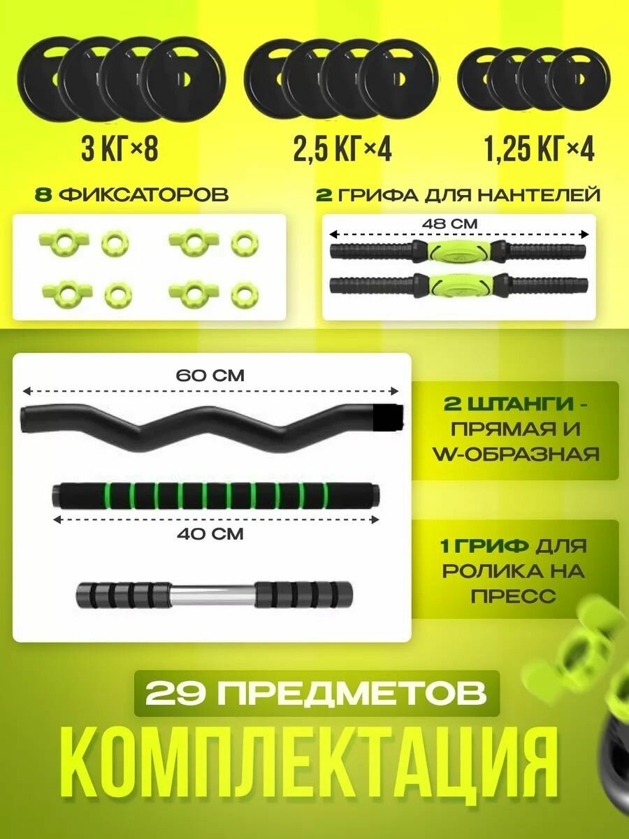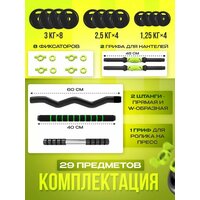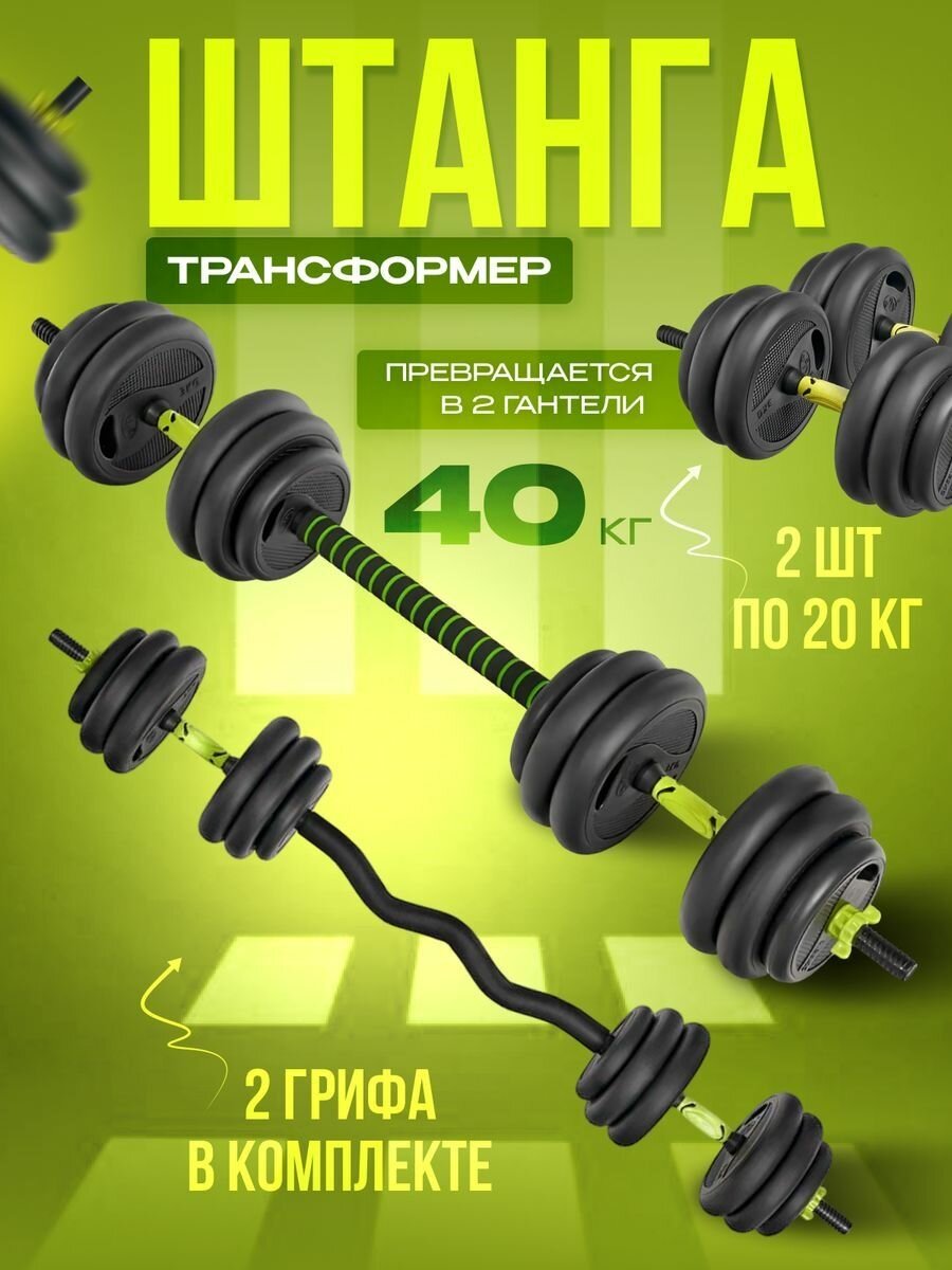 Наши гантели разборные со штангой — это идеальное фитнес-оборудование для любого домашнего тренажерного зала. Вы приобретаете штангу разборную весом 40 кг - идеальное оборудование для занятий тяжелой атлетикой, кроссфитом и другими видами силовых тренировок. Наша спортивная штанга предназначена для активных занятий спортом и фитнесом, обеспечивая высокое качество и надежность в использовании. Комплект представляет собой идеальное решение для тренировок в домашних условиях, заменяя тренировки в спортивных залах или фитнес клубах. С помощью этой штанги вы сможете разнообразить свою программу тренировок, выполняя множество упражнений для различных групп мышц. Штанга 40 кг с блинами обеспечивает широкий спектр тренировочных возможностей для спортивной фитнес-аэробики и силовых упражнений. Конструкция штанги позволяет удобно менять вес, а разборная конструкция облегчает хранение и транспортировку без потери качества и надежности. Два грифа прямой и W-образный обеспечат разнообразие в выполнении упражнений. По мимо этого штанга легко трансформируется в две удобные гантели по 20 кг. Также в комплекте идет гриф, который в соединении с блинами дадут вам ролик для пресса. Приобретая штангу разборную, вы получаете надежный и универсальный инвентарь для разнообразных программ тренировок. Этот товар предлагает широкие возможности для тренировок, что делает его оптимальным выбором для любого уровня подготовки и целей в области спорта и фитнеса.