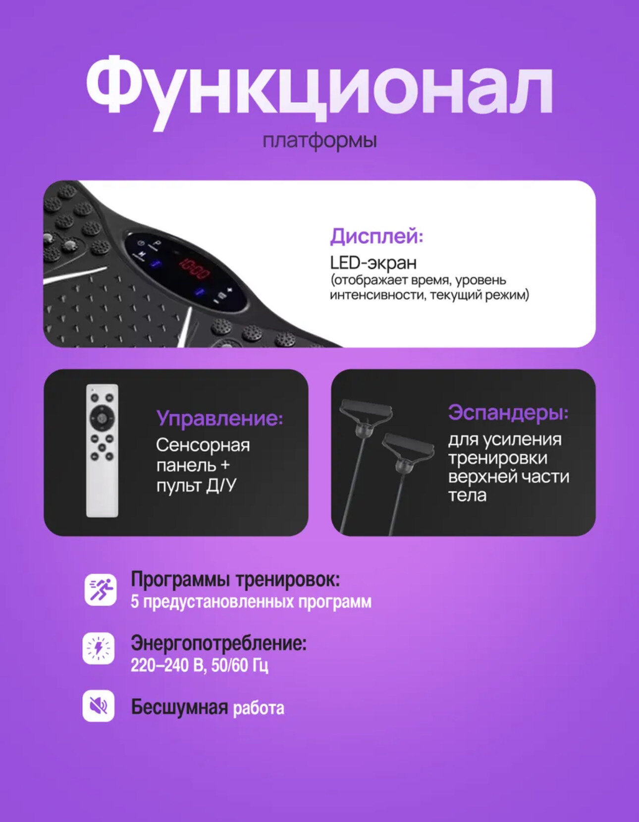 Виброплатформа - это одно из наиболее популярных среди клиентов устройств для домашнего фитнеса. Устройство имеет Bluetooth-подключение, чтобы пользователь мог слушать музыку или аудиокниги во время тренировки. Эспандеры в комплекте помогут создать дополнительную нагрузку на мышцы рук.