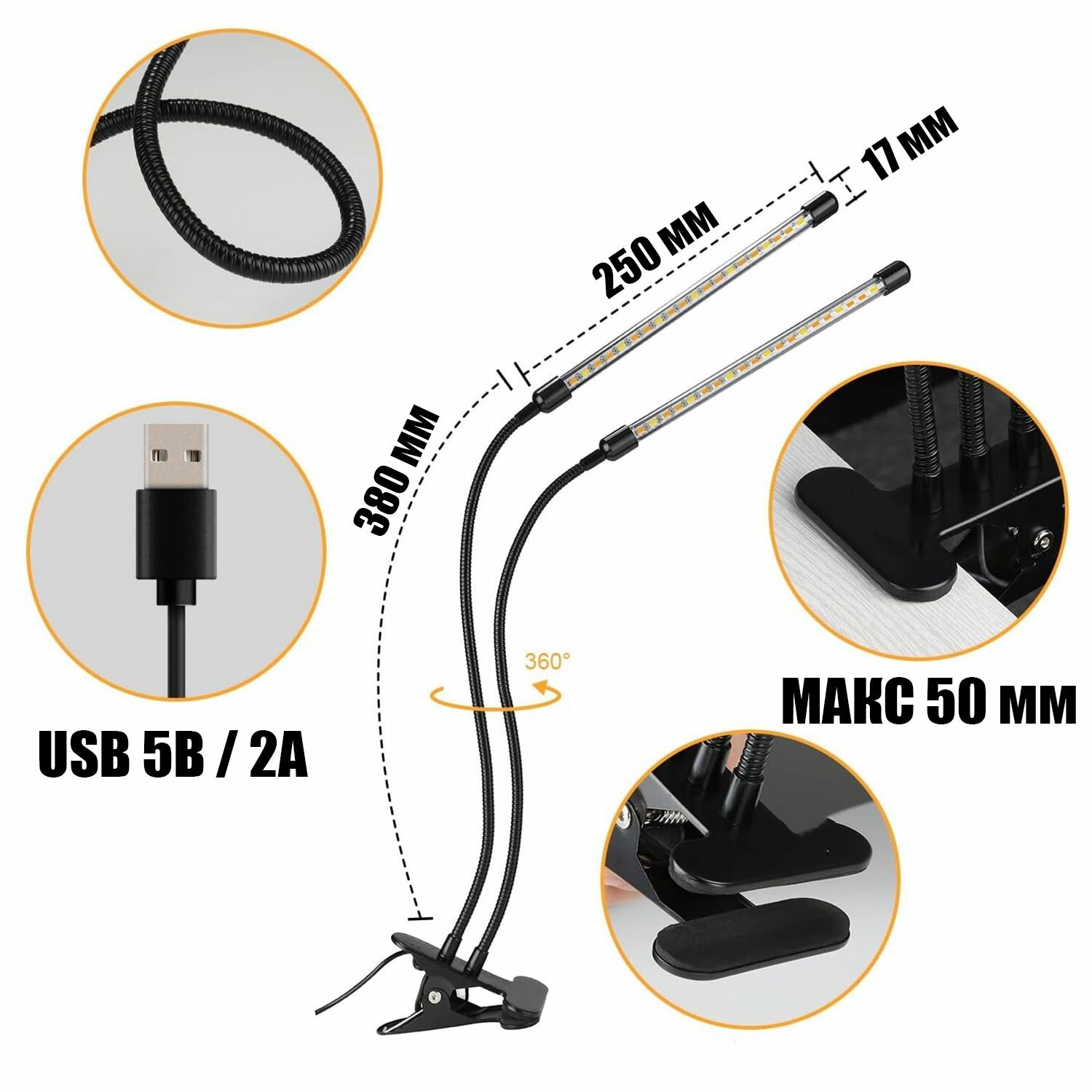 Фитолампа на прищепке, блок питания USB 5В / 3А