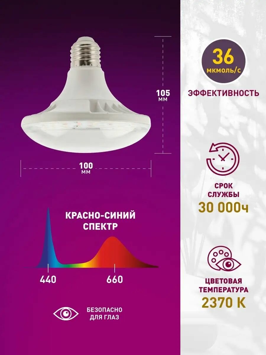 Фитолампа красно-синего спектра FITO-18W-RB-E27 бренда ЭРА поможет Вам вырастить свежие овощи! Достаточно расположить светильник на расстоянии 5-25 см от верхушек растений. Прекрасно подойдет для всех корнеплодов, в том числе редиса. Также для капусты и зелени, рассады пасленовых. Благодаря энергии красно-синего спектра ростки смогут получить все необходимые вещества для быстрого роста. Кроме того, ускоряются фотобиологические процессы, увеличивается выработка сахаров. Корпус выполнен из алюминия. Обладает хорошим теплоотводом, минимизирует нагрев светодиодов. Прозрачный рассеиватель сохраняет световой поток по сравнению с матовым на 30-60%. Фитосветильник с такой лампой можно применять не только для рассады, но и для взрослых растений. Отсутствие пульсаций не раздражает глаза. Цветовая температура 2370 К подарит приятное свечение. Светильник для растений ЭРА правильный выбор для Ваших растений!