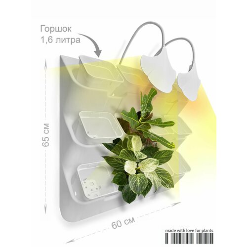 Особенность фитомодуля аэро заключается в наличии дополнительной системы вертикальных и горизонтальных воздушных каналов для обеспечения доступа воздуха в прикорневую зону и область дренажных отверстий горшка, что существенно улучшает аэрацию земляного кома, способствует проникновению кислорода, воды и питательных веществ в корни растений. Также аэрация способствует биологической активности почвы и исключает переувлажнение грунта. Фитомодуль предназначен для размещения и выращивания растений на вертикальной поверхности. На сегодняшний день данная конструкция фитомодуля не имеет аналогов по легкости монтажа, простоте ухода за растениями и объему грунта: 1. Вместимость 12 растений, размер 60х65х14 см (длинна, высота, глубина) 2. Вам надо прикрутить всего 2 шурупа и у Вас на стене уже размещено 12 растений 3. Простота ухода заключается в том, что вам не надо поливать каждое растение, вода заливается в поддон и питает сразу несколько растений, размещенных в этом поддоне. 4. Самый важный показатель: объем грунта. В данном фитомодуле используются объемом 1,6 литра (диаметр горшка 13х13х13 см). Данная модель имеет подсветку, состоящую из двух фитоламп с блоком управления, расположенным на верхней панели модуля. Мощность ламп 15 Вт LED Цвет свечения: теплый (кремовый) Питание от сети 220В. Функции блока управления: 1. Вкл/выкл; 2. Регулировка яркости освещения; 3. Таймер включения. С помощью данной кнопки выбирается и устанавливается программа освещения 3 или 9 или 12 часов. Подсветка работает в полностью автоматическом режиме, включая и выключая освещение каждый день в установленное вами время. Фитомодуль может применяться как для одиночного размещения (создание Фитокартин), а также для комплексного озеленения вертикальных поверхностей. При ручном поливе вода нормировано заливается в поддон из расчета 0,5 литра в каждый поддон. Влага впитывается грунтом через перфорированное дно горшка. Капиллярное смачивание грунта обеспечивает равномерное увлажнение при этом грунт не спрессовывается и остается рыхлым, обеспечивая доступ кислорода к корням растений. Оптимальный угол наклона растений и расстояние между поддонами гарантируют формирование равномерного растительного покрова с хорошей вентиляцией прикорневой зоны. Еще одно важное преимущество данного оборудования это идеальная форма торца модуля. Торцевая часть смоделирована и выполнена таким образом, что создает ощущение легкости конструкции, она не крадет пространство и смотрится изящно без дополнительного декорирования. Плавные формы поверхности позволяют идеально вписывать модули в многообразие дизайнерских идей в любом стилистическом оформлении. Фитостены, создаваемые на основе наших модулей позволяют рационально использовать пространство, сделать зеленую стену визуально легкой и избежать громоздкости конструкции. Размер модуля: ширина - 60 см высота - 65 см глубина – 14 см Вес: 4 кг Поставляется в индивидуальной упаковке Комплектация Комплект крепления Горшок квадратный объем 1,6 литр - 12 штук