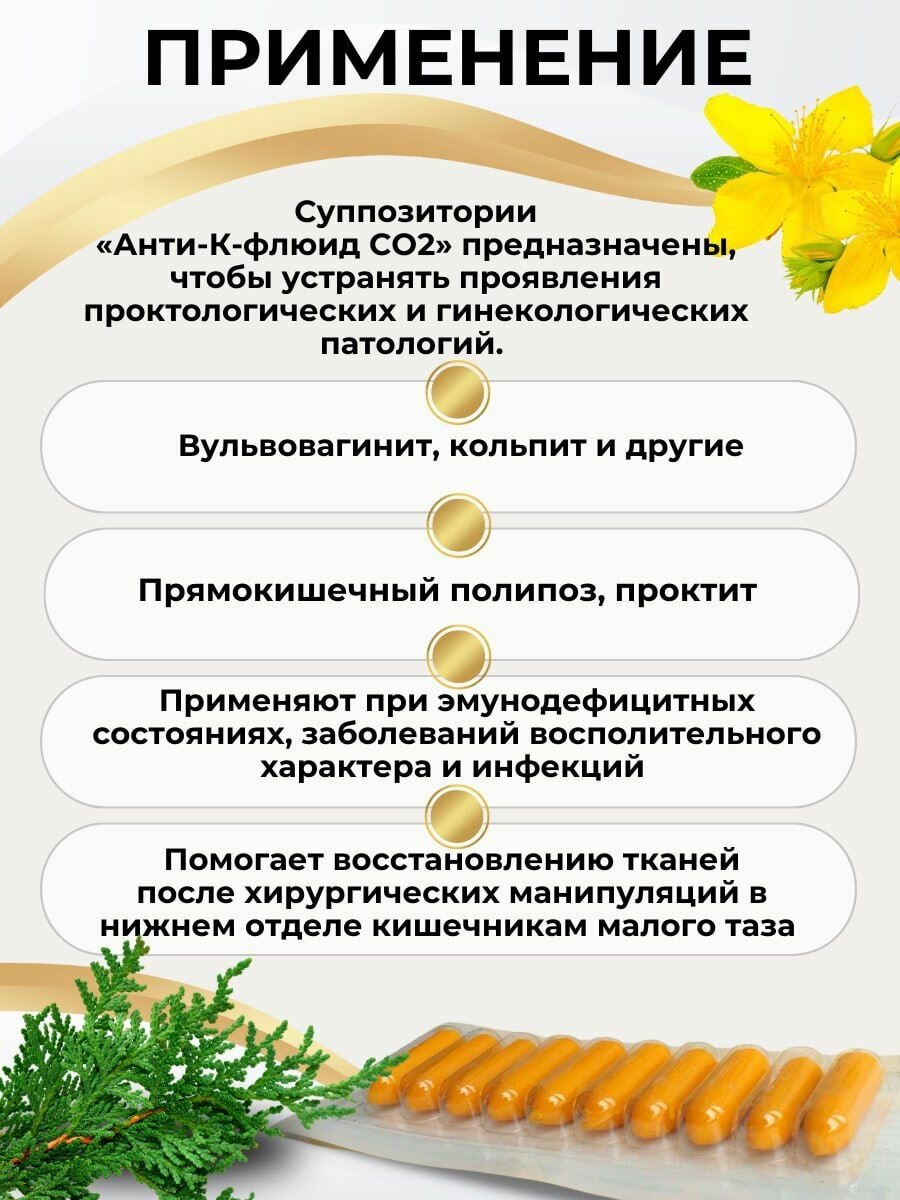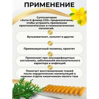 Фито-свечи новое поколение, усовершенствованная формула «Анти-к флюид CO2» относят к группе гомеопатических средств. Используются для проведения интимной гигиены. Они обладают увлажняющим и смягчающим эффектом. После их регулярного использования убирается воспаление и проявления раздражения слизистых и кожных покровов. В них включены только натуральные ингредиенты. Суппозитории предназначены, чтобы устранять проявления проктологических и гинекологических патологий. Они оказывают общеукрепляющее действие на организм. Основными оказаниями для применения этого препарата служат воспаления женской половой сферы (вульвовагинит, кольпит и другие) инфекционного и грибкового характера. Также поможет при проктите и различных формах геморроя. Заживляет трещины прямой кишки, язвенные болезни и прямокишечный полипоз. Свечи применяют при иммунодефицитных состояниях. Они помогают восстановлению тканей после проведения хирургической манипуляции на нижнем отделе кишечника и в зоне малого таза. Оказывают воздействие на кожу и слизистые. Эпителий становится толще. Восстанавливается индекс созревания клеток. Исчезает ощущение сухости. Восстанавливается микрофлора. Уменьшается интенсивность зуда и жжения. Повышается эластичность тканей влагалища. Они поддерживают на естественном уровне показатели кислотно-щелочного и водно-липидного баланса. Фитосвечи активно применяют в народной медицине. Растительный состав препарата обогащен витаминами. Еще продукт содержит микроэлементы, биоактивные вещества и аминокислоты. Не содержится синтетических компонентов, продуктов нефтепереработки и гормонов. Показания: грибковые кольпиты и вульвовагиниты, воспалительные процессы в женских половых органах, трещины и язвы прямой кишки, геморрой, проктиты, хирургические вмешательства на органы малого таза и нижнего отдела кишечника, снижение иммунитета, ослабление организма после инфекций и операций.