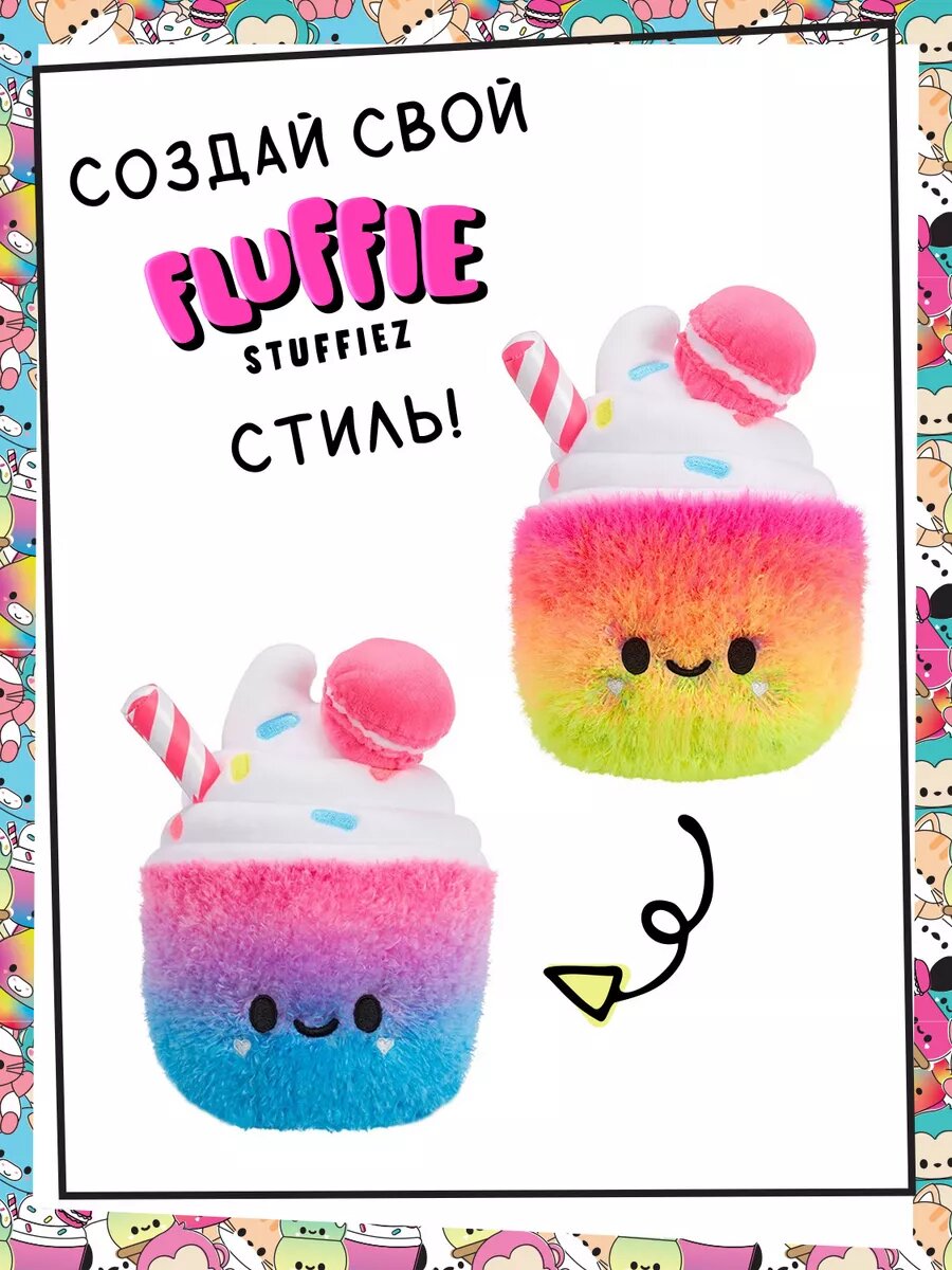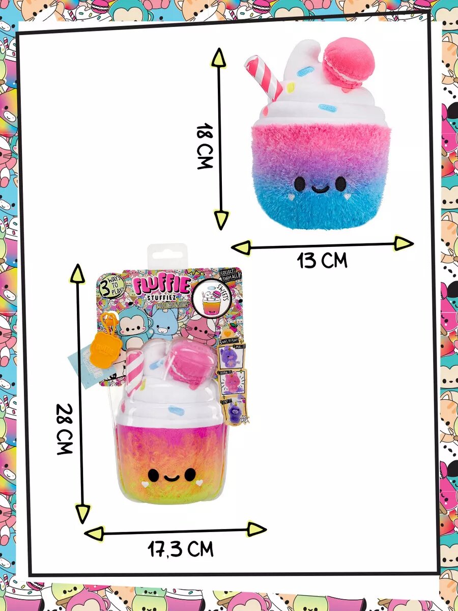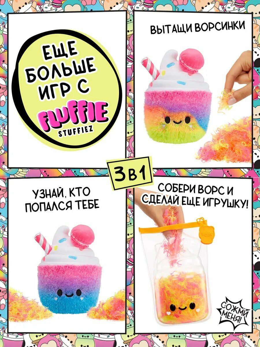Собери всех персонажей флаффи стаффиз – Милкшейк Чери, Котёнка Фиону, Собаку Феликса, Обезьяну Гуаву, Мороженое Рожок Скуп и Пегасов Глитци и Твинкл! Устрой выщипательный челлендж у себя дома!