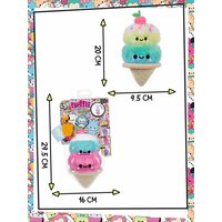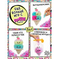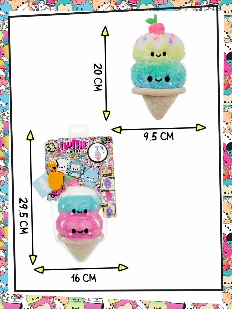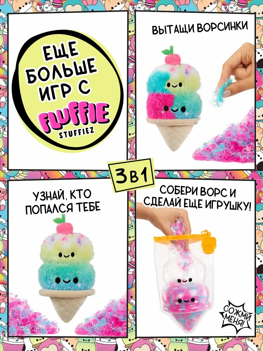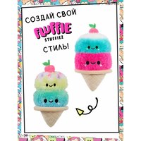 В игровом наборе Флаффи Стаффиз Мороженое Рожок мягконабивная игрушка высотой 20 см со специальным ворсом, который можно выщипать из игрушки, а также особый аксессуар, выполняющий роль чехла для выщипанного ворса. Чехол-упаковку можно открывать и закрывать, чтобы наполнить его снова или распределить цветной ворс по-новому.