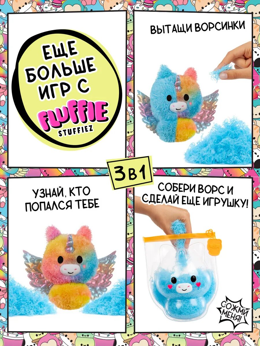 Собери всех персонажей флаффи стаффиз – Милкшейк Чери, Котёнка Фиону, Собаку Феликса, Обезьяну Гуаву, Мороженое Рожок Скуп и Пегасов Глитци и Твинкл! Устрой выщипательный челлендж у себя дома!