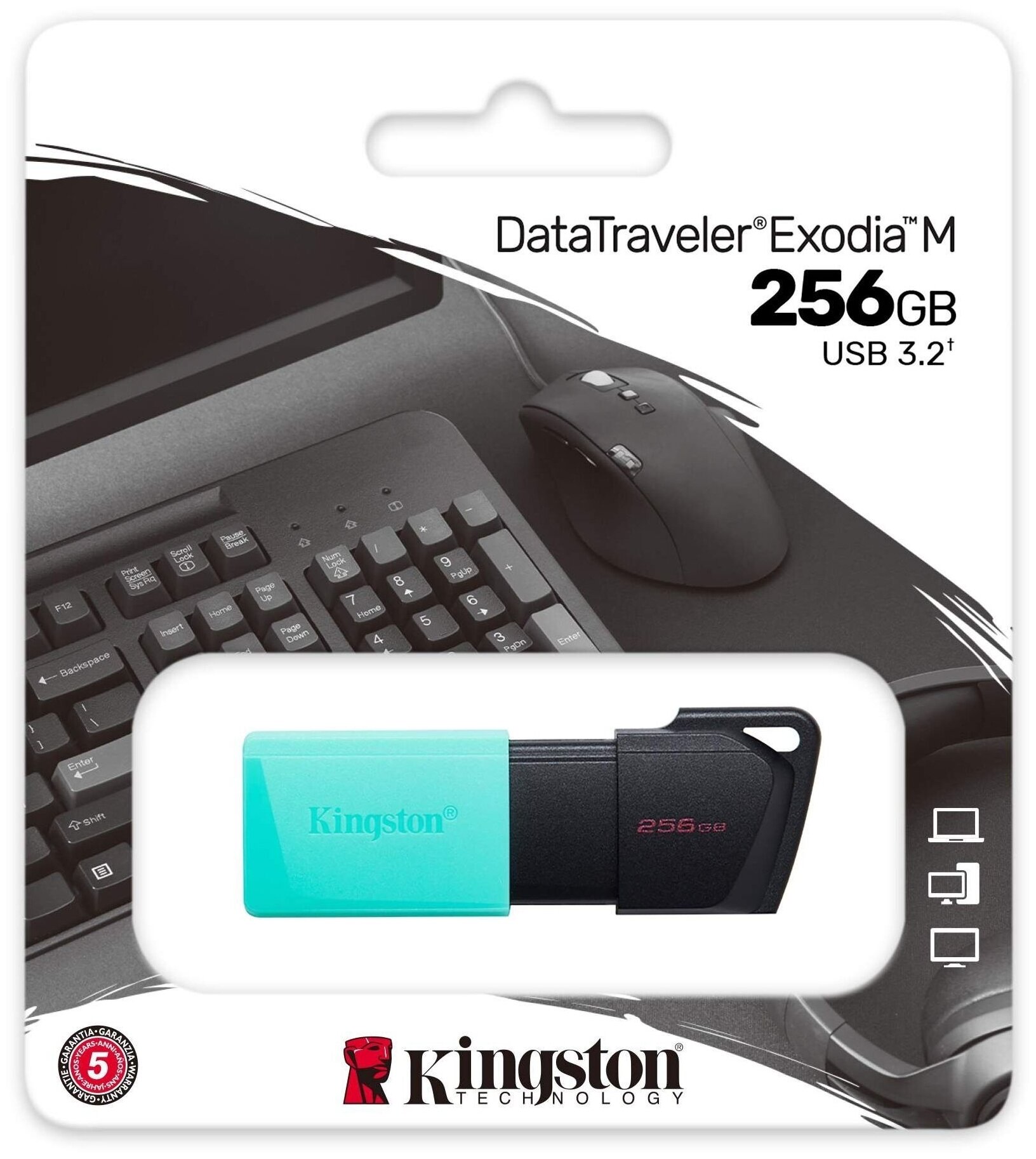 Память USB Flash Kingston DataTraveler Exodia М выполнена в миниатюрном бирюзовом корпусе из пластика. Выдвижной механизм позволяет легким движением открыть USB-разъем и защищает его от механических повреждений. Накопитель содержит 256 ГБ, что позволяет сохранить огромную музыкальную коллекцию, фильмов, видеороликов, а также коллекцию фото. Компактные размеры делают устройство незаменимым в поездках и походах к друзьям. Накопитель Kingston DataTraveler Exodia М подключается при помощи интерфейса USB 3.2 Gen1. Поддержка USB 3.0 и USB 3.1 Gen1 говорит о широкой совместимости с компьютер