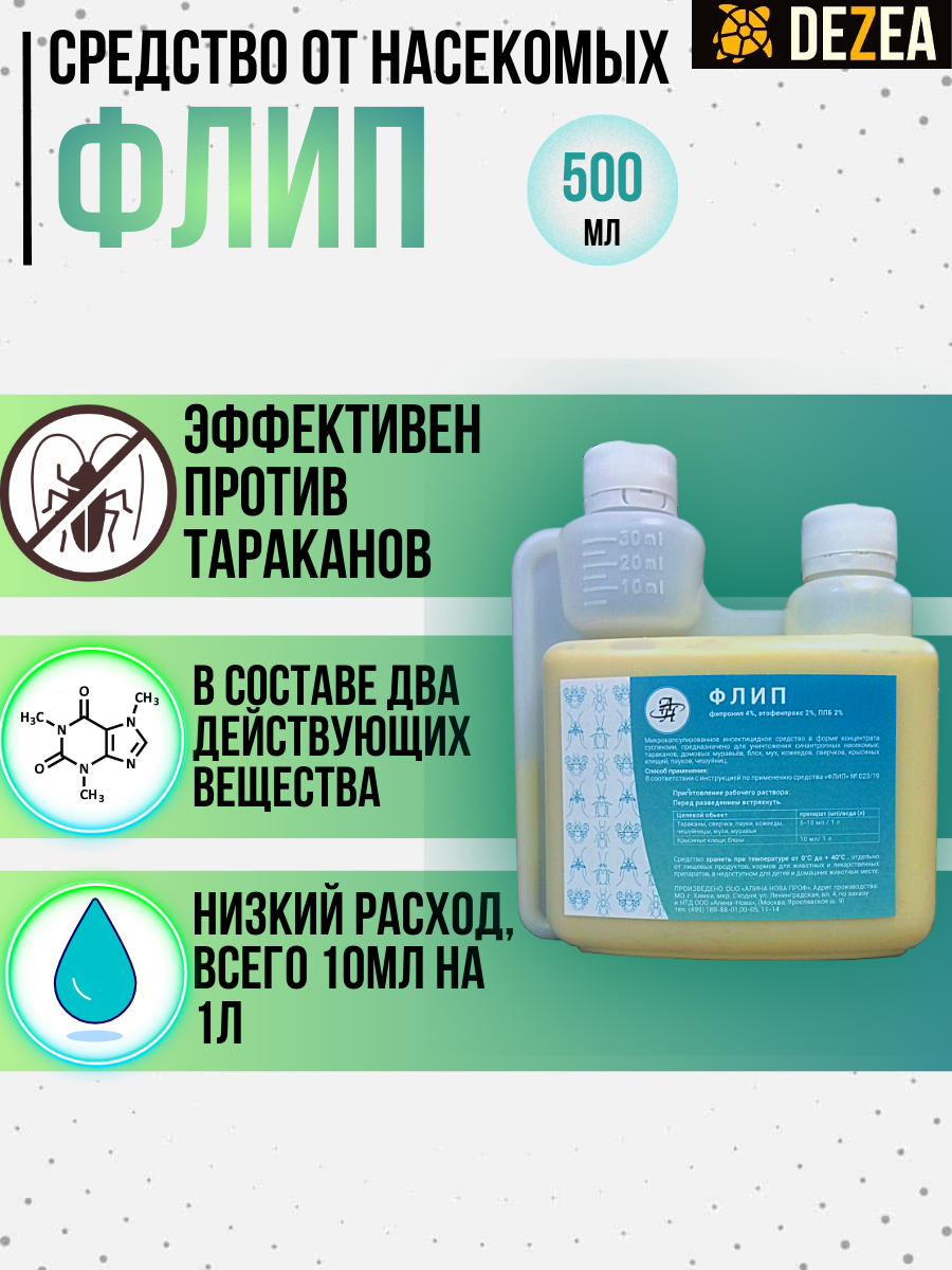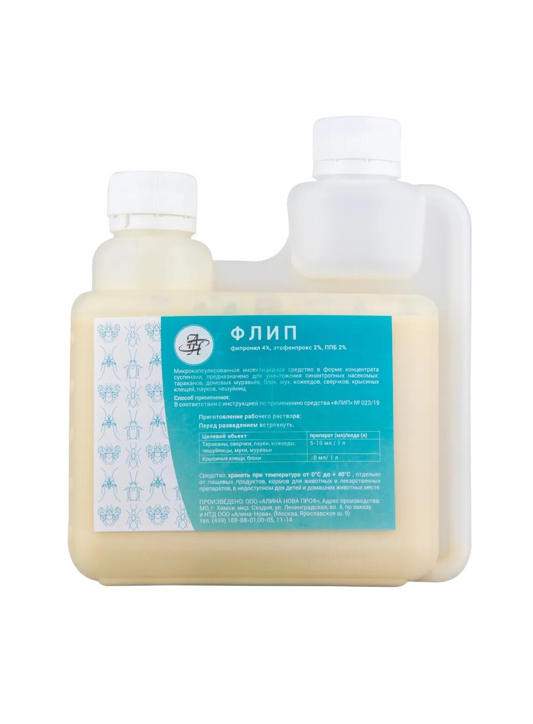 «Флип» представляет собой непрозрачную жидкость, упакованную во флакон с дозатором. Объем упаковки — 500мл. Цвет — от белого до светло-бурого. Действующие вещества, входящие в состав препарата, обладают разными свойствами. За счет этого повышается эффективность воздействия и уменьшается риск развития привыкания. В состав препарата входят следующие инсектициды: фипронил(4%), этофенпрокс (2%), пиперонилбутоксид (2%).