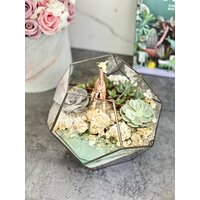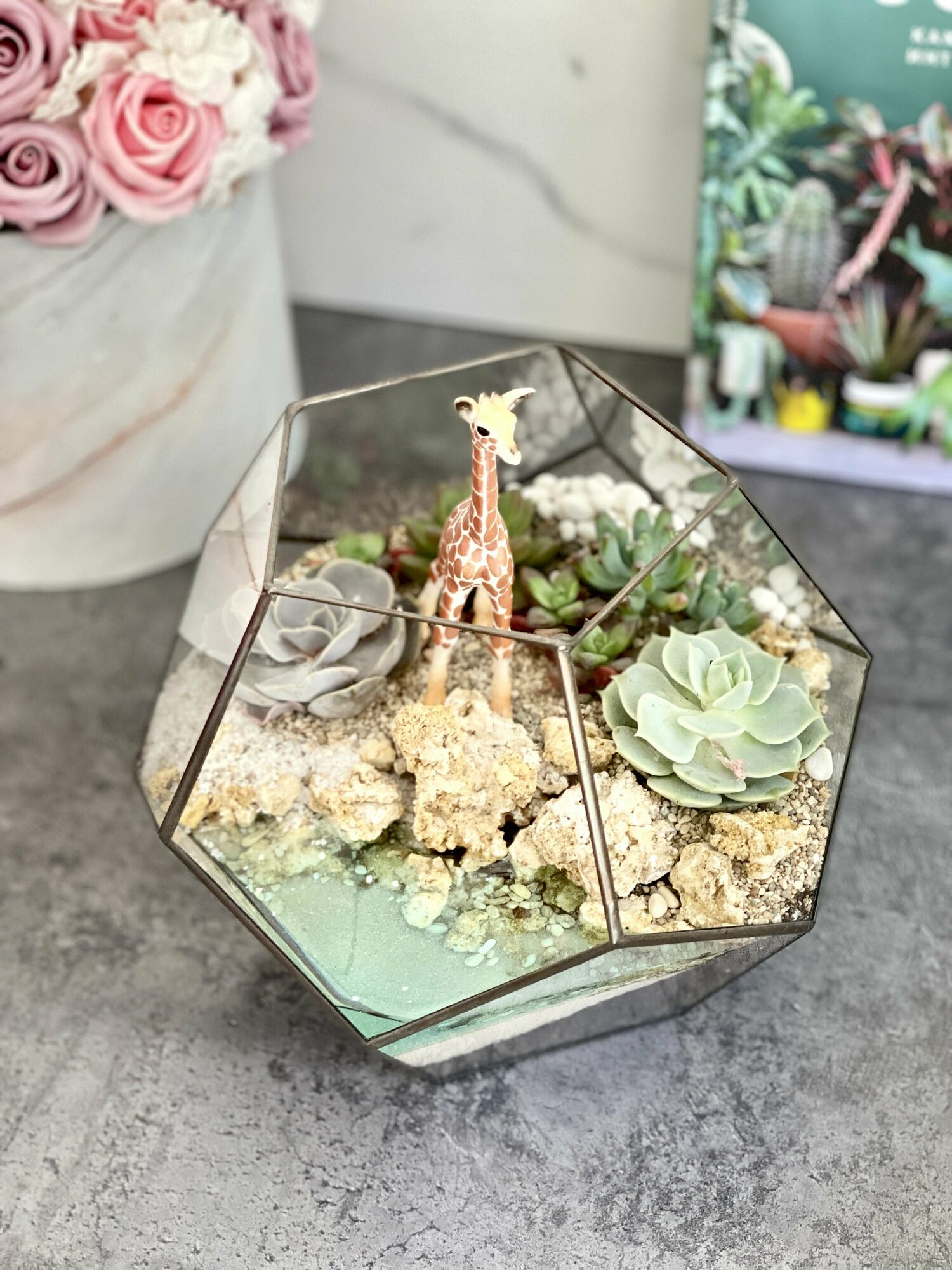 Флорариум "Додекаэдр с Водоемом" - стеклянная геометрическая фигура с самыми неприхотливыми растениями суккулентами (от лат. Succulentus, в переводе "сочный"). Композиция представляет собой кусочек природы с животным у водоема. Композиция включает в себя от 5 до 7 штук суккулентов разных видов. В качестве декора используются камни, белая галька, полудрагоценный камень, ракушки, стабилизированный мох и песок.