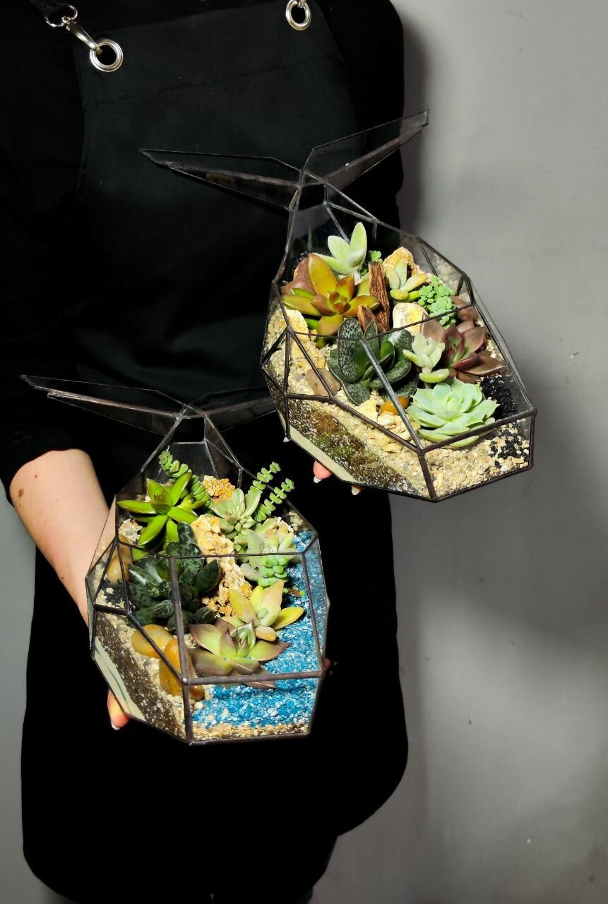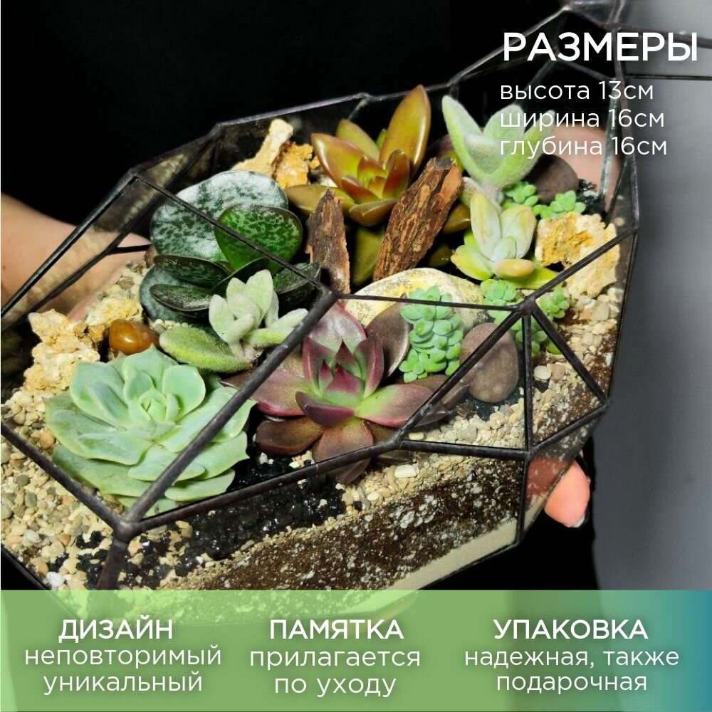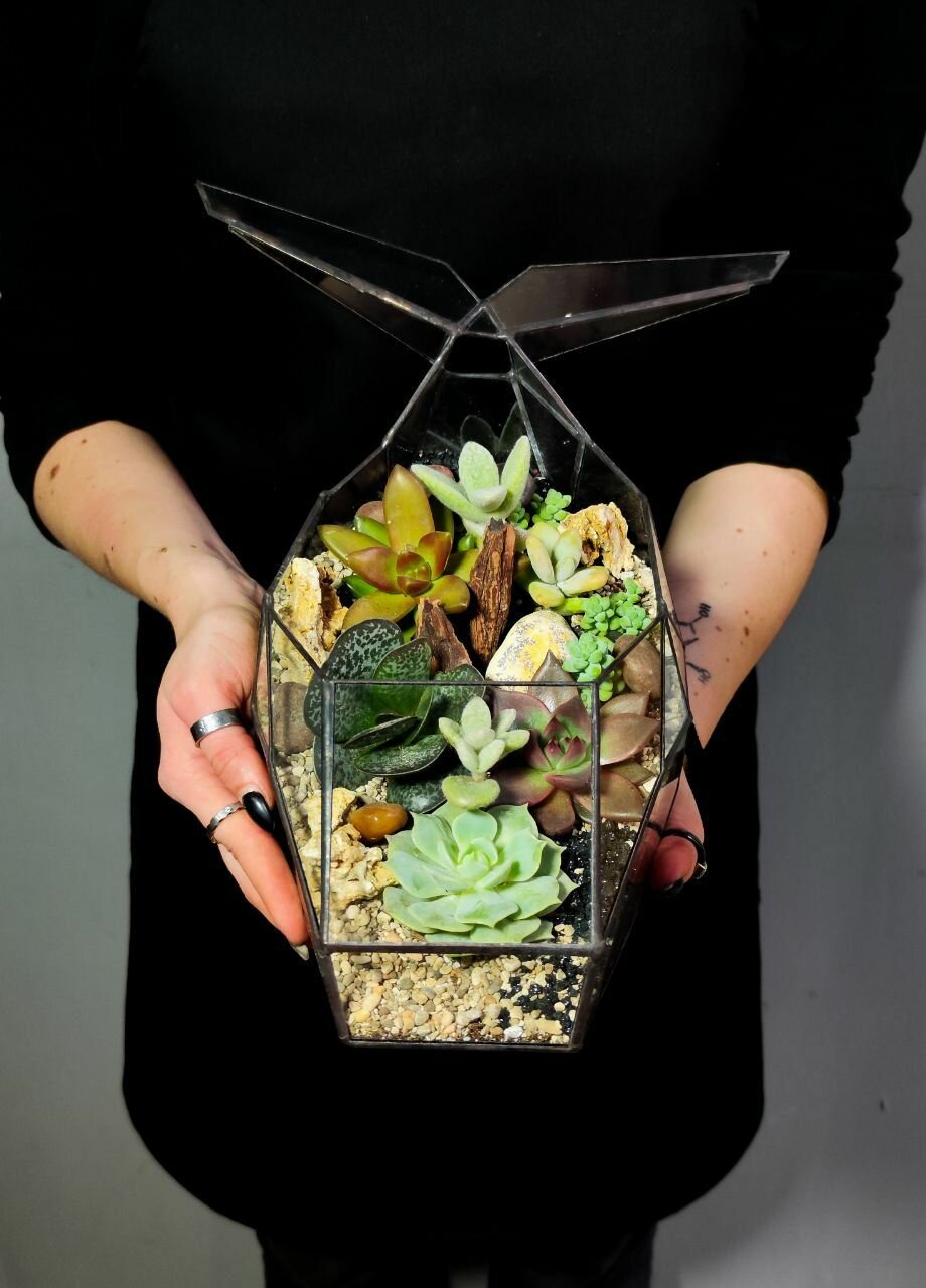 Флорариум «Кит» с суккулентами - стеклянная геометрическая фигура с неприхотливыми растениями суккулентами (от лат. Succulentus, в переводе "сочный").