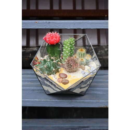 Одна из самых популярных форм флорариума наполненная кактусами и суккулентами станет отличной идеей для подарка близкому Вам человеку или необычным и ярким украшением интерьера Вашего дома.