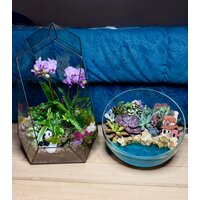 Флорариум - живой тропический сад на вашем столе. Это оригинальный сделанный вручную живой подарок и идеальное украшение интерьера дома, ресторана и офиса. Кроме того, можно не просто купить готовый мини-сад, а заказать его изготовление по индивидуальному эскизу, с учетом всех пожеланий по поводу оформления. Флорариум с несколькими видами ярких и имитацией воды, станет прекрасным подарком родным, близким, коллегам. Композиция потребует минимального ухода и будет радовать вас круглый год. Инструкция по уходу и подарочная упаковка прилагаются.