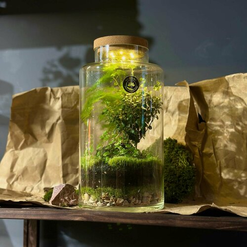 • Это живая экосистема, где циркулирует влага и происходит естественный обмен веществ. Внутри флорариума живут микроорганизмы, растения и мох, создавая баланс, который поддерживается самостоятельно. Экосистема живет своей жизнью, требуя минимального ухода.