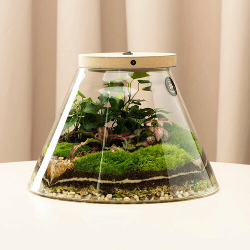 Это живая экосистема, где циркулирует влага и происходит естественный обмен веществ. Внутри флорариума живут микроорганизмы, растения и мох, создавая баланс, который поддерживается самостоятельно. Экосистема живет своей жизнью, требуя минимального ухода.