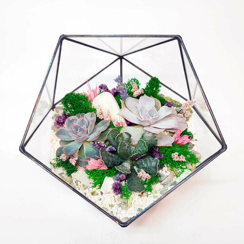 Икосаэдр с композицией из нежно-розовой Эхеверии Лилацина, Мистери и Адромискуса. Идеальный подарок для милых дам.