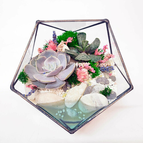 Икосаэдр с композицией из Эхеверии и Адромискуса с озером в сиреневых тонах: самая популярная наша композиция!