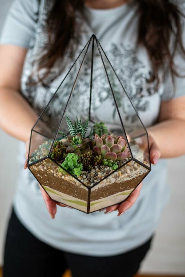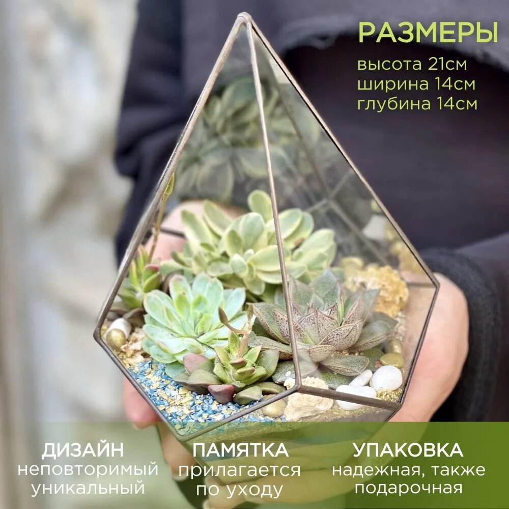 Флорариум "Капля" малая - самая популярная композиция, стеклянная геометрическая фигура с самыми неприхотливыми растениями суккулентами (от лат. Succulentus, в переводе "сочный"). Стильное украшение дома и офиса, подходит под любой интерьер. Оригинальный живой подарок себе или близким.