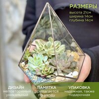 Главное правило по уходу - редкий полив. В зависимости от времени года, 2-4 раза в месяц малым количеством воды под корень. Суккуленты предпочитают светлое местоположение, поэтому флорариум следует ставить в места с достаточным количеством естественного или искусственного света. Не забывайте также периодически протирать флорариум мягкой тряпкой без использования химических средств и убирать отмершие части растений. Инструкция по уходу прилагается.
