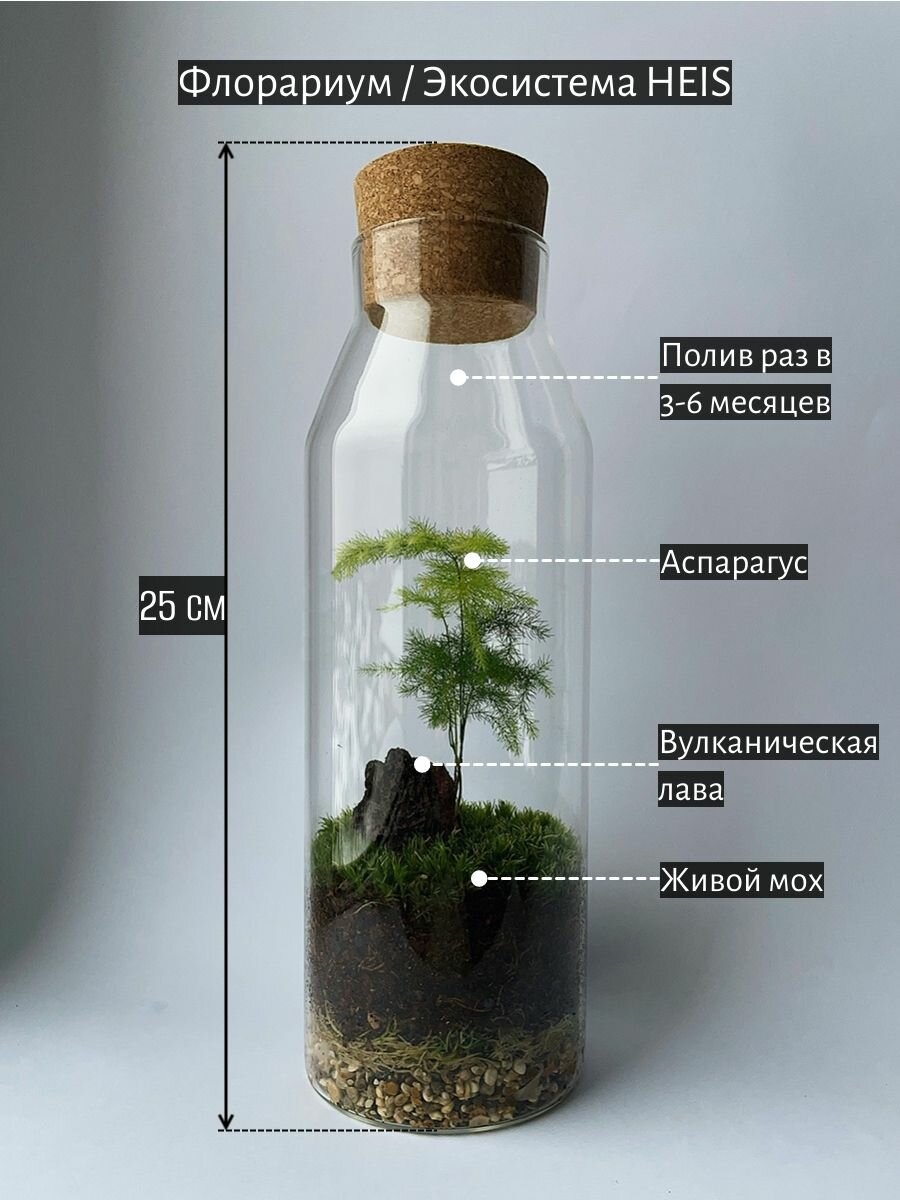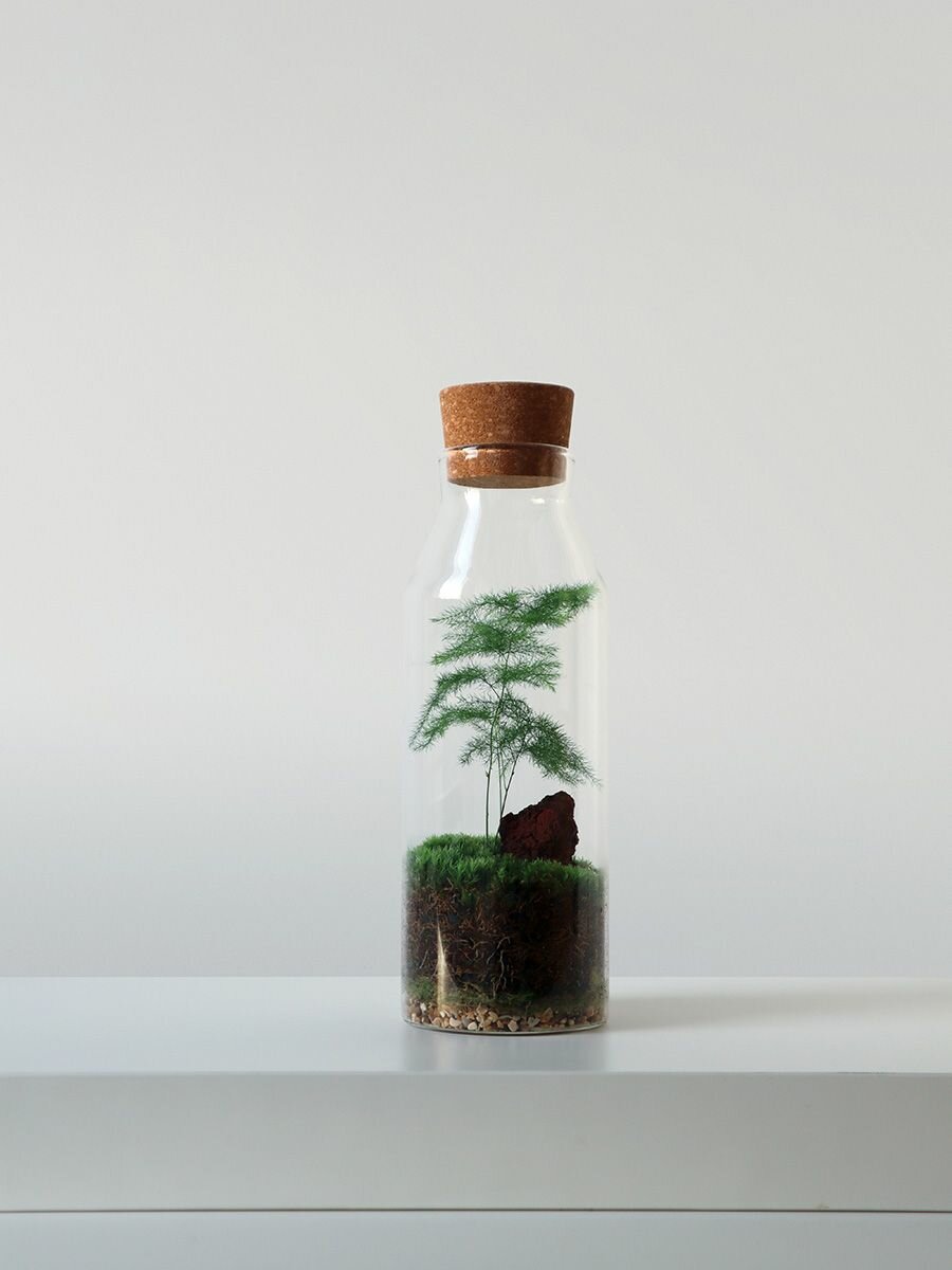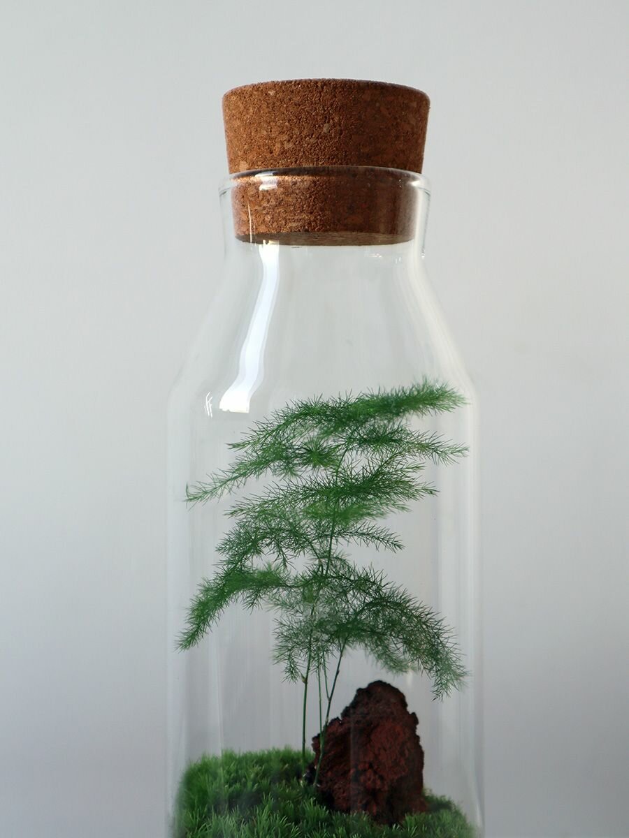 Аспарагус Classic S — это закрытый флорариум с живым аспарагусом и мхом. Он сочетает в себе современный дизайн и природную эстетику. Каждый экземпляр собирается вручную в стеклянной колбе с натуральной пробковой крышкой. Такой флорариум придаёт пространству немного зелени и спокойствия, не перегружая его деталями.