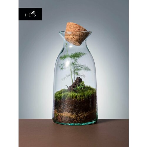 - Оригинальная форма сосуда. Внутри — полноценная экосистема в стекле: стекло, пробка и натуральные материалы, собранные в простом и чистом дизайне.