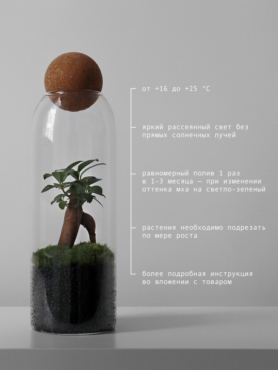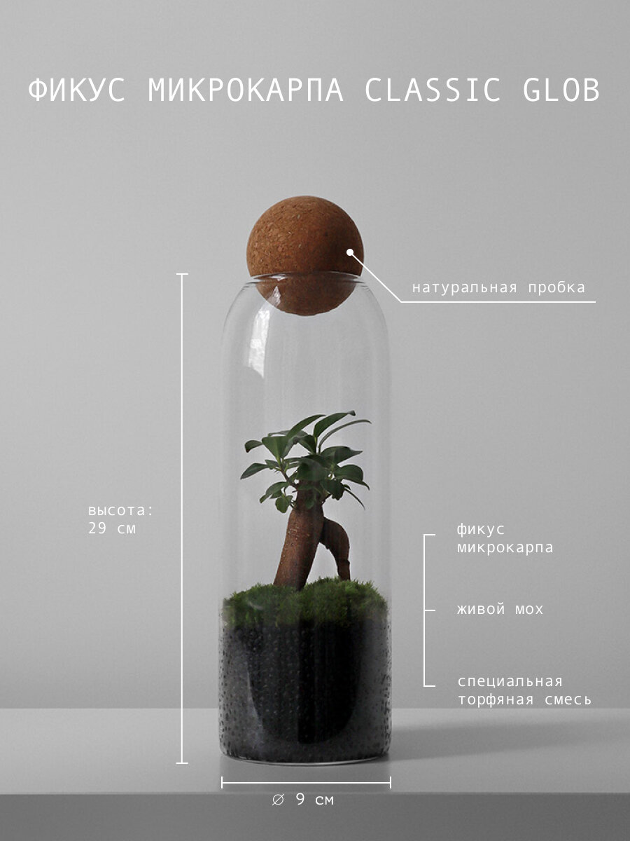 Фикус микрокарпа Classic Glob — это флорариум с живым фикусом и мхом. Он сочетает в себе современный дизайн и природную эстетику. Каждый экземпляр собирается вручную в стеклянной колбе с натуральной пробковой крышкой. Такой флорариум придаёт пространству немного зелени и спокойствия, не перегружая его деталями.