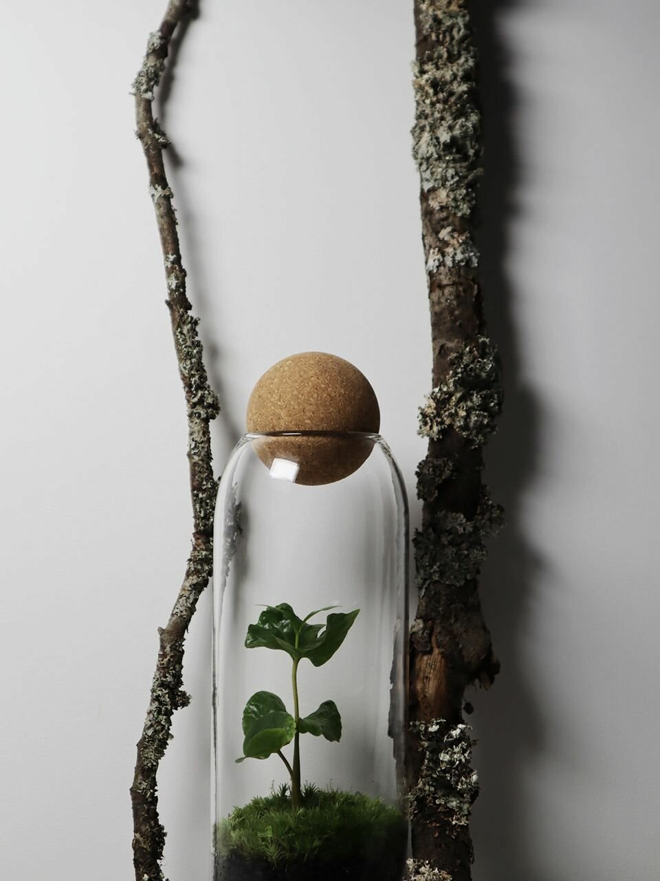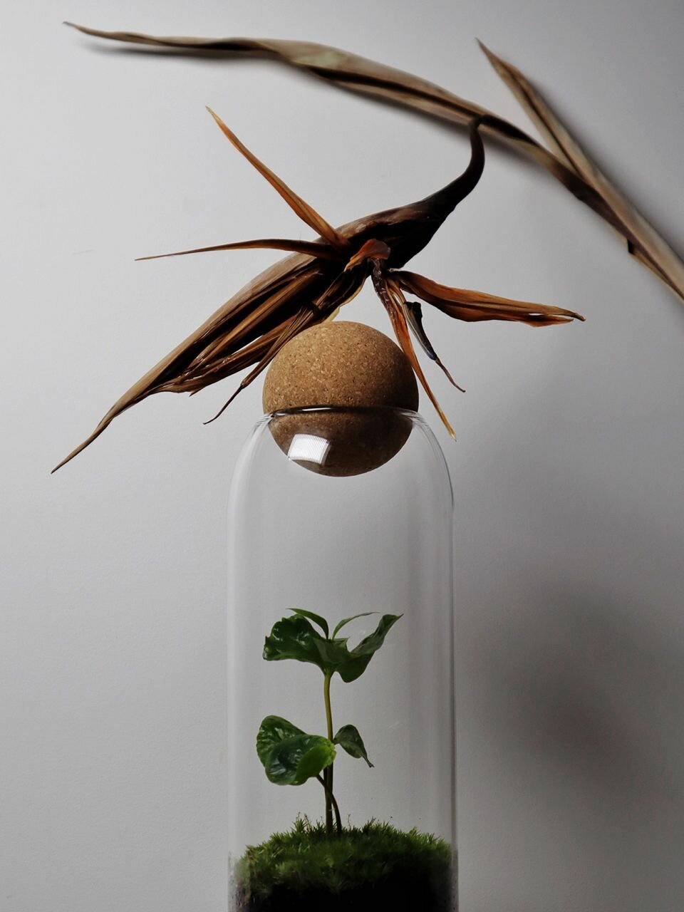 Внутри стеклянного флорариума находится кофе Арабика, которое не только украшает ваш дом, но и способствует улучшению атмосферы благодаря своим природным свойствам. Эта замкнутая экосистема не требует частого ухода, что делает её идеальным вариантом для тех, кто не располагает временем или навыками ухода за растениями
