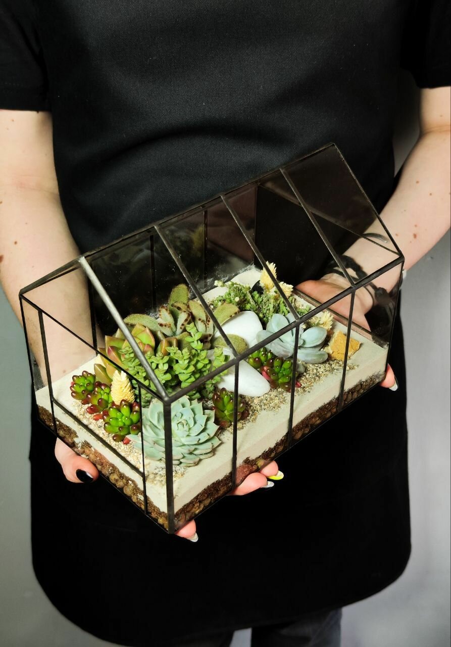 Флорариум "Теплица" - оригинальная стеклянная геометрическая фигура с самыми неприхотливыми растениями суккулентами (от лат. Succulentus, в переводе "сочный"). Стильное украшение дома и офиса, подходит под любой интерьер. Оригинальный живой подарок себе или близким.