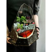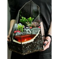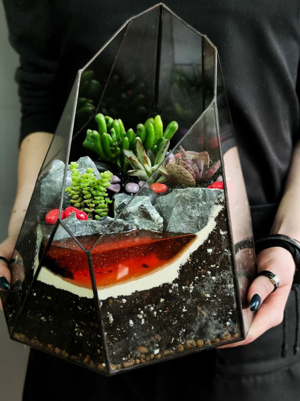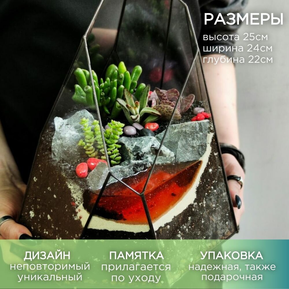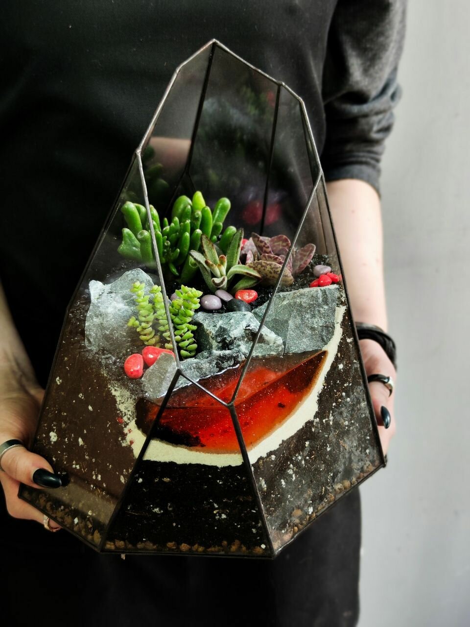Флорариум "Вулкан" - яркая композиция с оригинальным дизайном, напоминающим природную гору с отвесными крутыми склонами, сделанными из натуральных камней, и кратером, наполненным лавой, сделанной из эпоксидной смолы. Стильное украшение дома и офиса, подходит под любой интерьер. Оригинальный живой подарок себе или близкому.