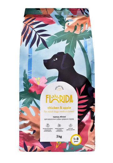 Florida Chicken and Apple - сухой корм супер-премиум-класса с курицей и яблоком взрослых собак средних пород. Сбалансированное полнорационное питание, способствующее правильному функционированию всего организма и нормализации пищевых процессов. В рационе кормов Florida используется только белок животного происхождения.